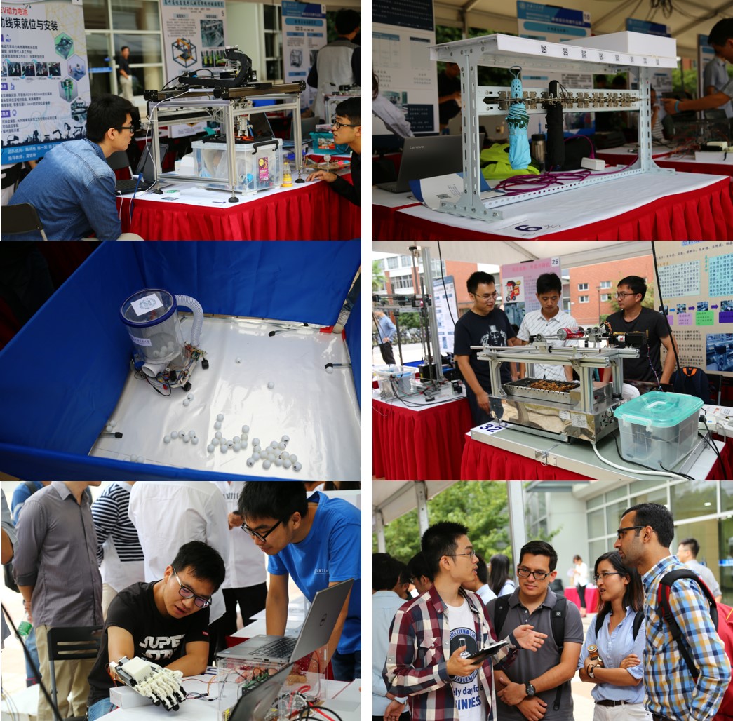 在课程项目展示环节, 7个教学班推出的34组项目团队在机械动力学院A楼广场进行项目展示。同学们通过展板和视频展示、实物演示和现场互动等环节,向评委及观众介绍了精心完成的作品,如:应用于电动汽车生产过程中动力电池总成装配环节的自动化线束插口对接设备、针对目前共享雨伞锁体结构简单回收雨伞困难而设计的基于物联网的雨伞共享平台、基于人手动作模式设计灵感的手指康复机器人、针对学校图书馆24小时还书机开发的智能图书整理小车、针对现有老人护理床功能和自动化程度缺陷问题而设计的多功能医护床、实现家居管理信息化的Insight家居智能互联系统、针对市面上导盲仪器价格昂贵而设计的智能导盲机器人等等。经过企业专家评委和校内专家评委的评选,智能图书整理小车等15组作品入围课程项目竞赛环节。