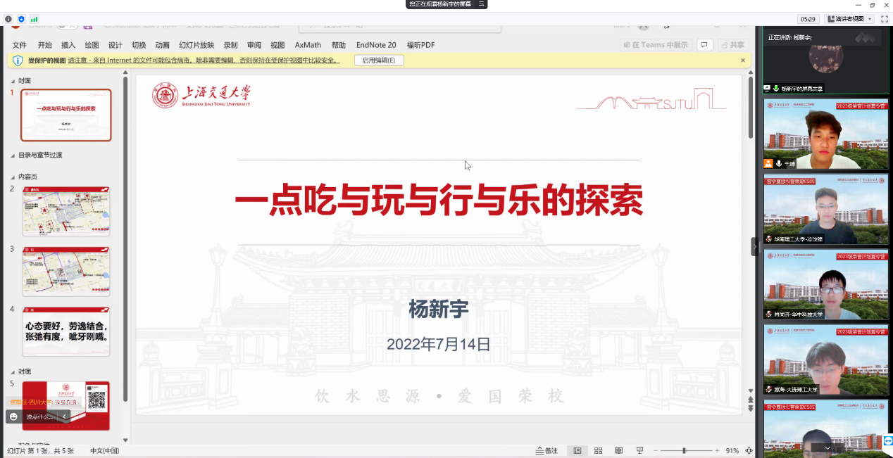 14日下午的师生互动环节上,20位营员分为两组进行了个人报告分享。营员们精心准备并分享了自己本科阶段的学习经历、实践活动以及未来科研规划等内容。每位营员风格迥异、内容饱满、积极介绍、展现自我,并与参会的荣誉计划导师们进行了深入的互动。