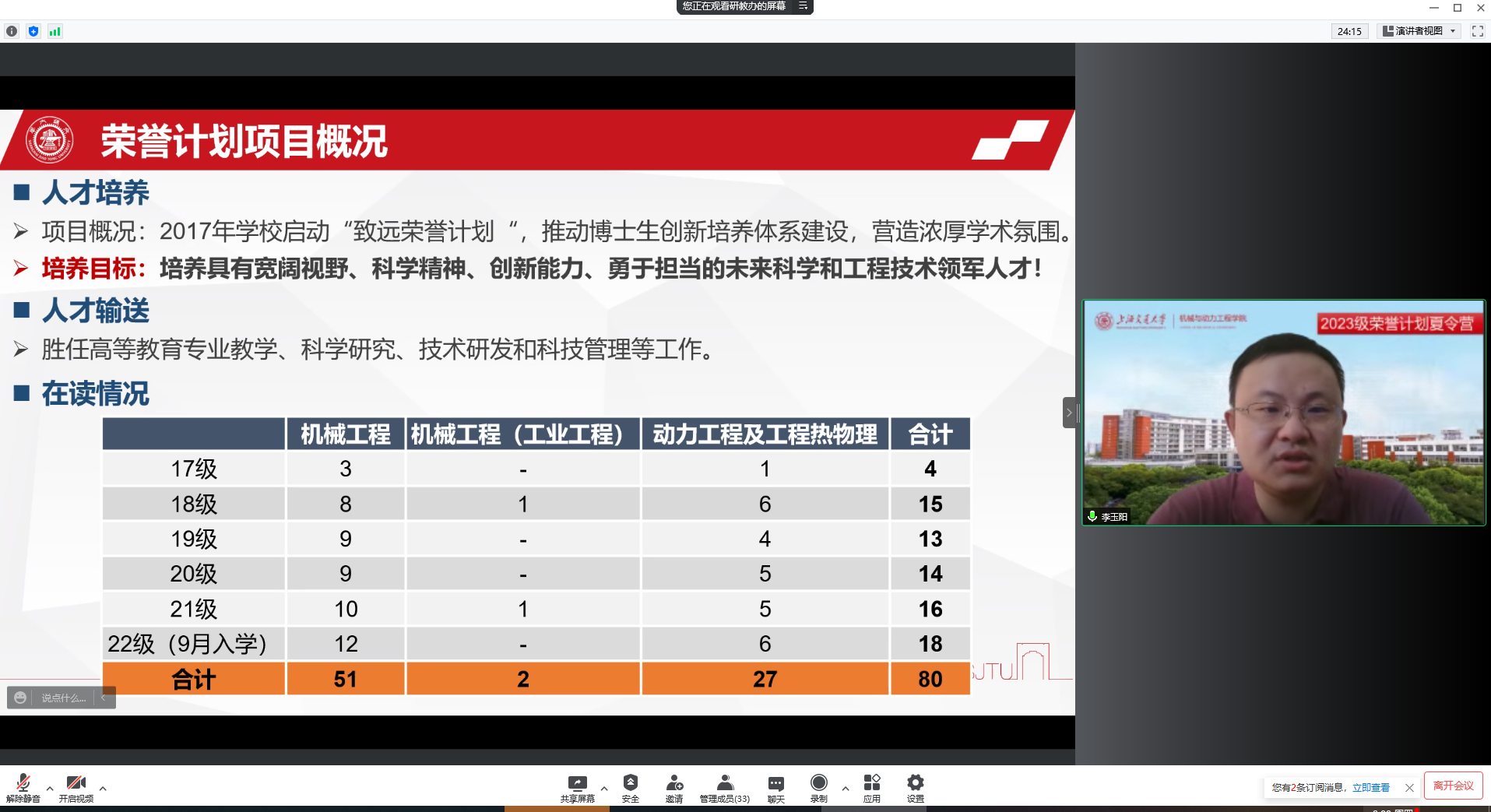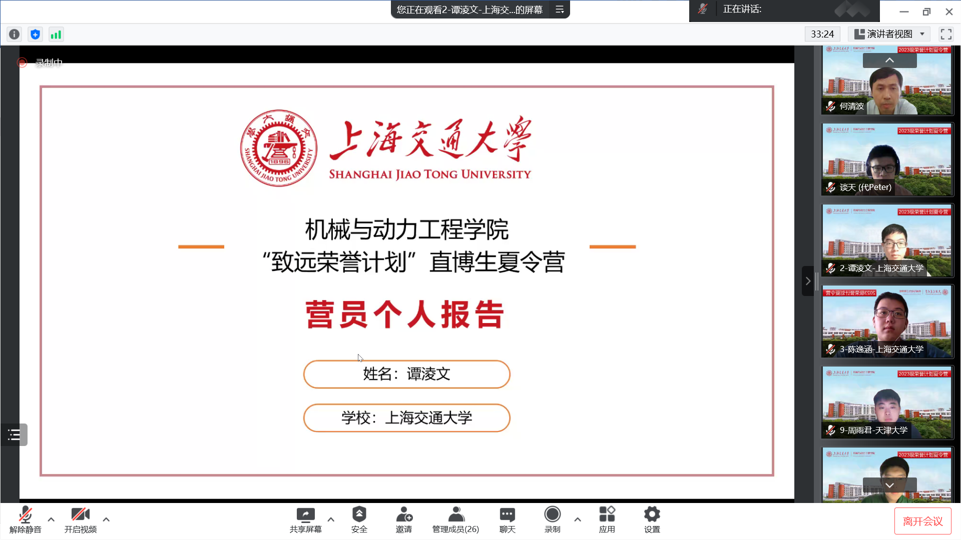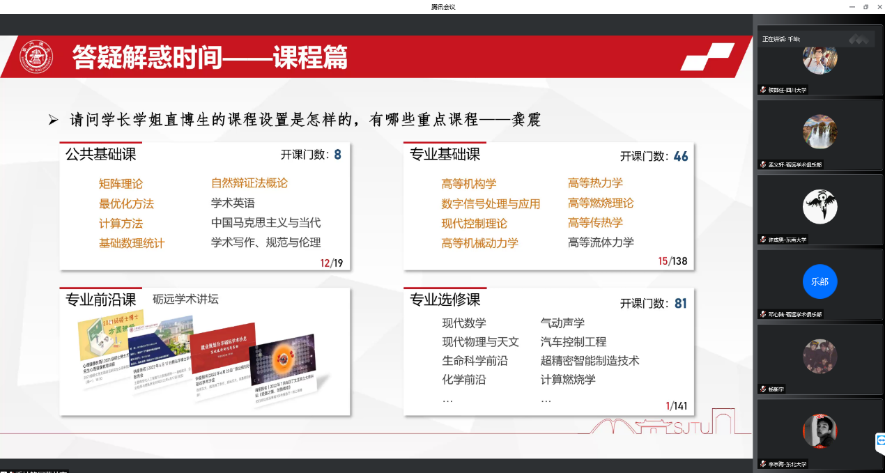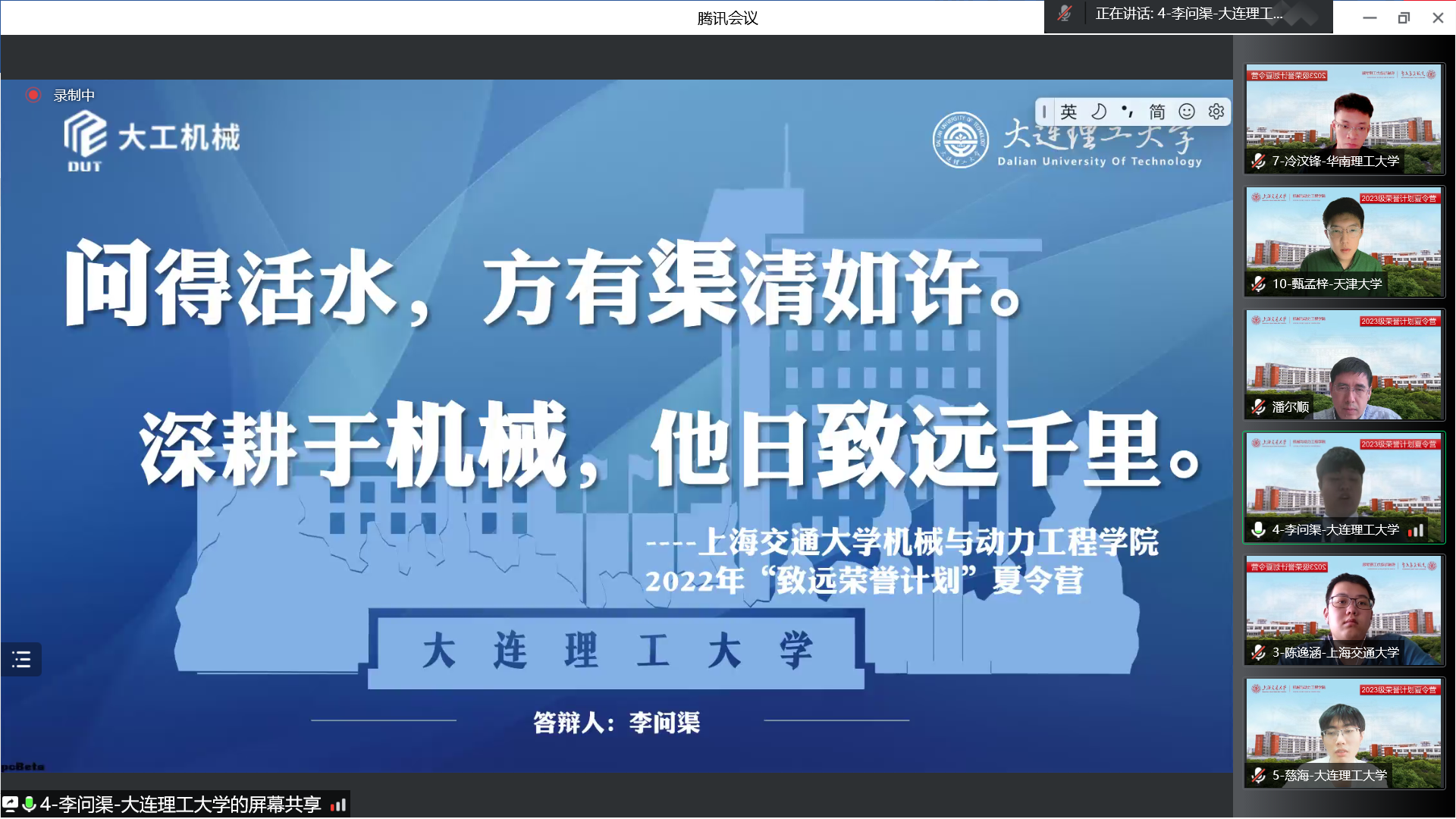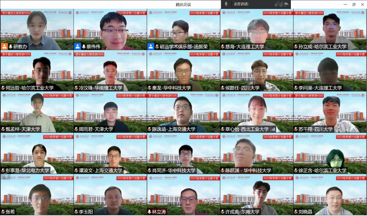 7月14日-15日,beat365中文官方网站第三届“致远荣誉计划”直博生云端夏令营成功举办。学院院长杜朝辉教授、党委书记林立涛教授、副院长李玉阳教授、重大装备设计与控制工程研究所所长高峰教授、制冷与低温工程研究所吴静怡教授、燃料电池研究所所长章俊良等,与来自beat365中文官方网站、西安交通大学、哈尔滨工业大学、华中科技大学、天津大学、大连理工大学等14所高校的20名优秀学子在云端相聚,进行深入浅出的学术交流,完成思想与智慧的碰撞。