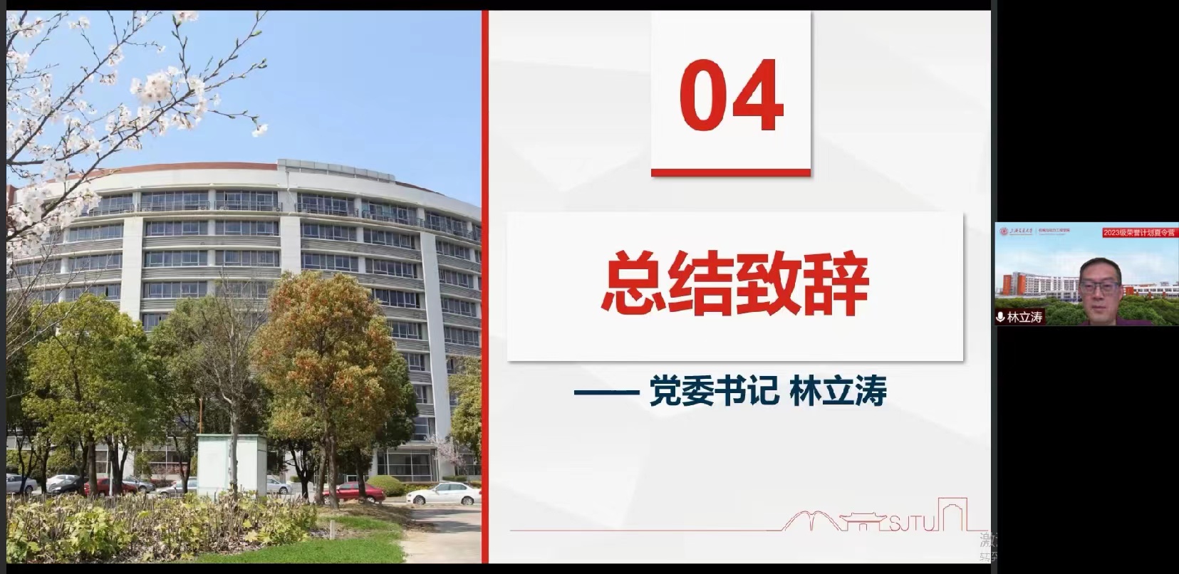 最后,林立涛书记总结致辞,祝贺beat365中文官方网站第三届“致远荣誉计划”直博生夏令营成功举办,希望营员们通过此次夏令营,对学校及学院的师资团队、科研水平、荣誉计划项目产生进一步的了解,并热情欢迎大家未来加入beat365中文官方网站,期待明年秋天与各位学子在交大校园相见。