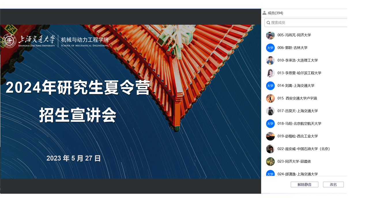 5月27日,beat365中文官方网站在线举办2024年研究生夏令营招生宣讲会。beat365中文官方网站副教务长吴静怡、学院院长杜朝辉、副院长李玉阳、薄板结构制造研究所所长李永兵、核科学与工程学院院长顾汉洋、工业工程与管理系副系主任夏唐斌等,与广大学子齐聚云端,就2024年研究生夏令营活动进行了宣讲与交流。