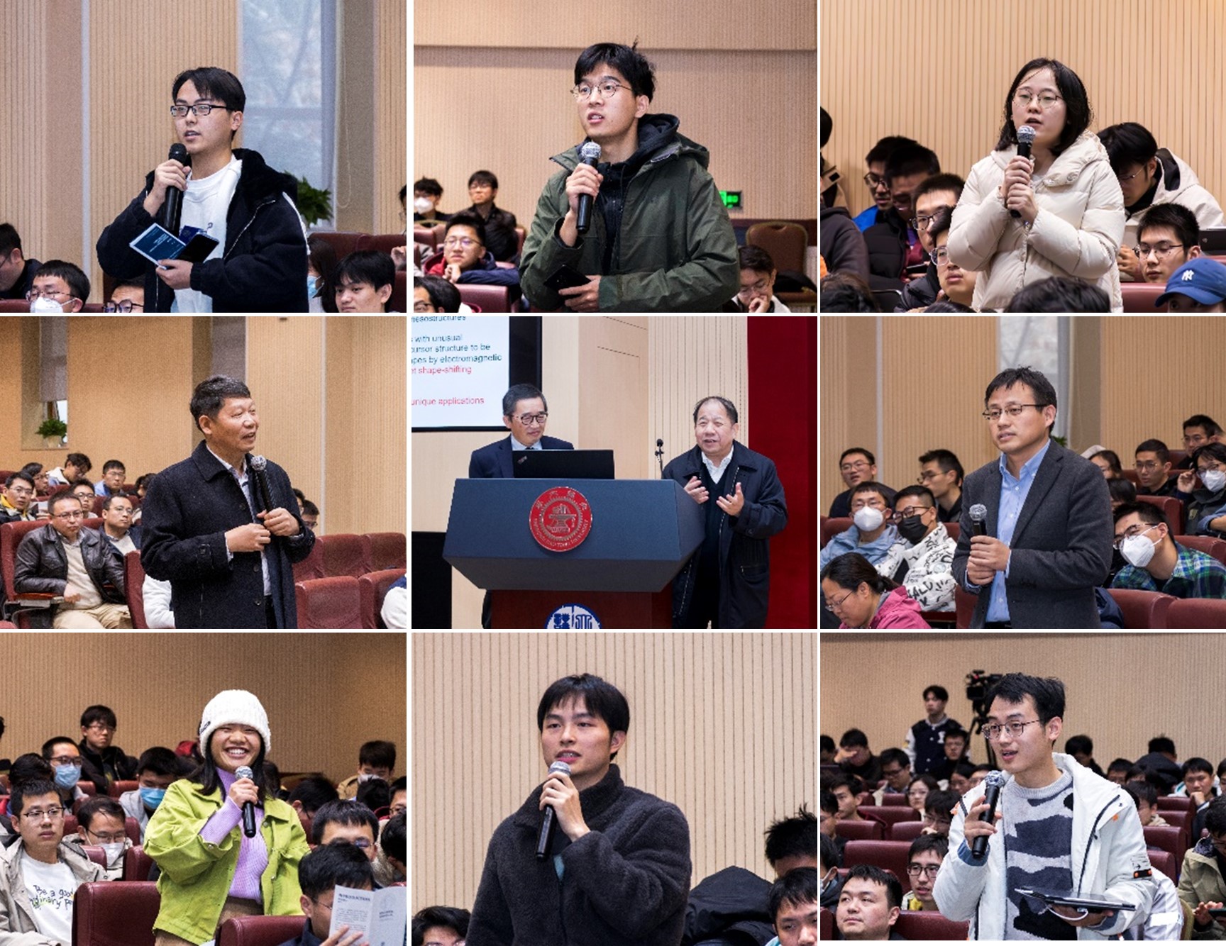 黄永刚院士从生物动态变形软材料系统引入,深入浅出地介绍了一种由分布式洛伦兹力驱动的可编程机械超表面,展示了响应时间在 0.1 秒以内的复杂动态变形功能,并建立数控驱动方案,实现了三维目标形状的高精度自进化逆向设计。最后介绍了动态变形软材料在实施原位立体成像和微型机器人设计和驱动策略等方面的应用前景,并与参会师生进行了互动交流。
