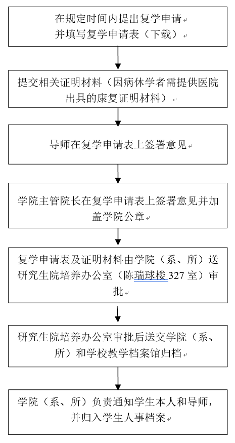 研究生休学期满要求复学者,需填写《beat365中文官方网站研究生复学审批表》,经学院(系、所)分管院长审核同意,报研究生院批准后办理复学手续。