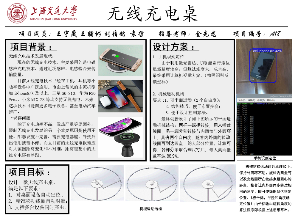 1.  提出一种无线充电桌的设计方案,即对桌面上的手机进行定位,之后自动搬运线圈,并且支持多台设备同时充电。
