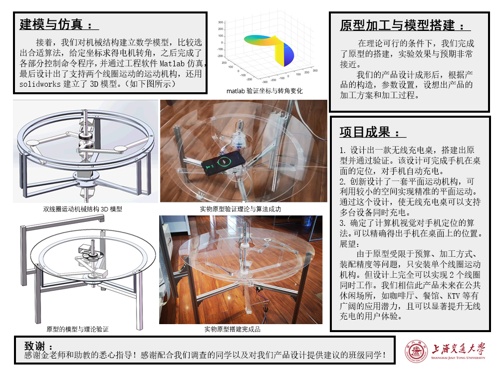2.  创新设计了一套平面运动机构,可利用较小的空间实现精准的平面运动。通过这个设计,无线充电桌可以支持多台设备同时充电。