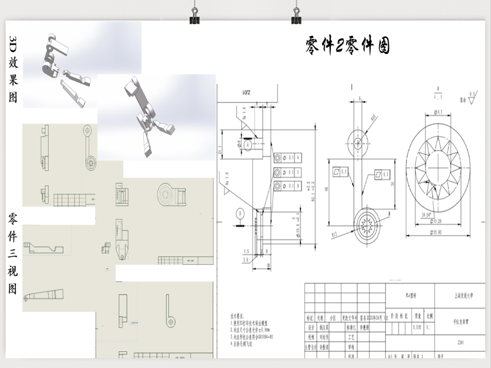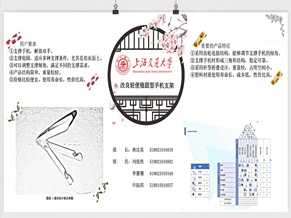 随着智能手机、平板电脑在人们工作、学习、娱乐中发挥着日益重要的作用,手机支架的市场需求持续增长。但市面上的产品大多存在着使用角度单一、结构笨重、稳定性不足等种种问题,本小组在产品调研与问卷调查的基础上对手机支架做轻便化、稳固化的改良设计,通过设计与制造一课程所学知识详细设计了产品的结构与加工方案。小组设计的轻便稳固型改良手机支撑架在保证产品结构小巧轻便、支撑手机稳固可靠的基础上,着重在调节手机支撑倾角、适应多重支撑条件上做出了改良创新,以期满足用户的更高要求。