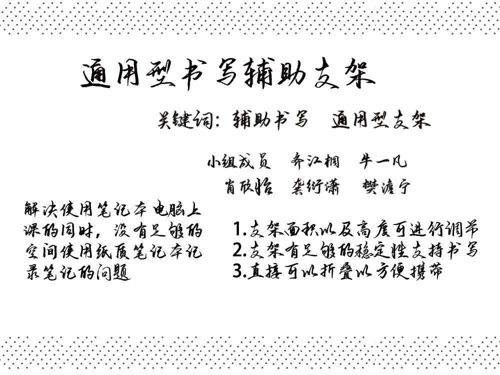 电子产品盛行的时代,笔记本电脑已经成为现代人不可或缺的生活工具。但是由于尺寸的限制,导致在面积较小的桌面使用笔记本电脑时,很难再同时使用纸质笔记本进行其他工作。在了解到网课期间同学们遇到的“使用笔记本电脑上课的同时,没有足够的空间使用纸质笔记本记录笔记”的难题后,我们提出并设计了一款通用型书写辅助支架,通过扩展可使用面积解决空间不足的问题。