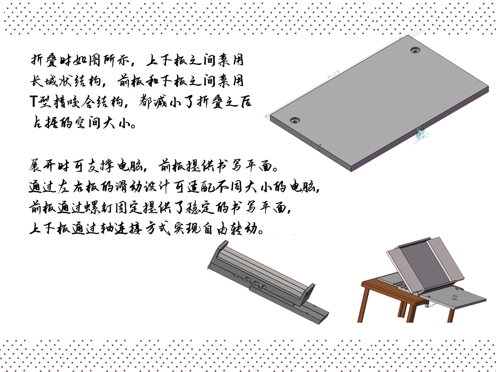 2、 最终版产品通过板与板之间的轴连接、T型卡槽连接、方形槽支撑,板与桌面之间的螺钉固定和三角形支撑结构等方式实现了自由调节支架倾角与高度、拓展桌面可用面积、提高书写体验、自由组装的功能。