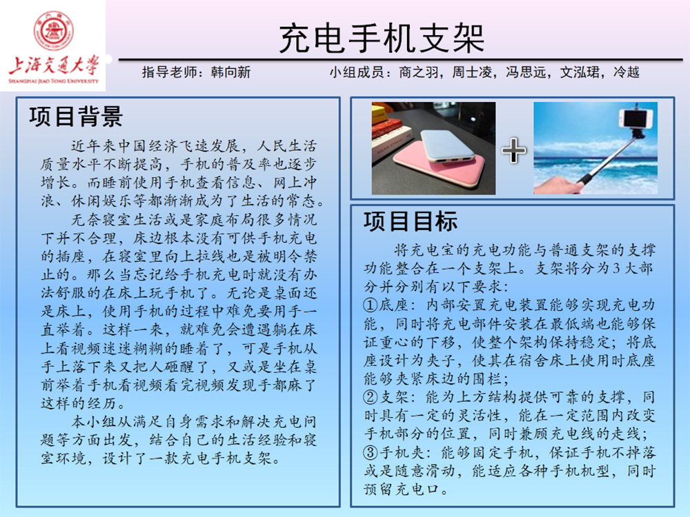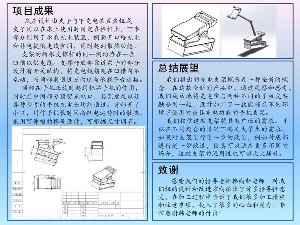 我们小组的项目“充电手机支架”从多方面进行设计考虑,充分地基于用户的需求和自身的设计理念逐一分析了多个构成部件的设计,不仅考虑到充电装置设计、内部结构设计、支架架构与材料,还考虑到材料的舒适性、美观性、性价比等等。概念设计图分为固定手机部分,支架连接部分,支架底座固定部分,充电部分。对底座支架和手机夹及底座的夹持部分也进行重点考虑,同时进行了solidworks动画模拟使用过程,以确保实用性。虽然我们没有做出成品,但我们通过三维制图和模拟分析对其可行性进行了细致的分析