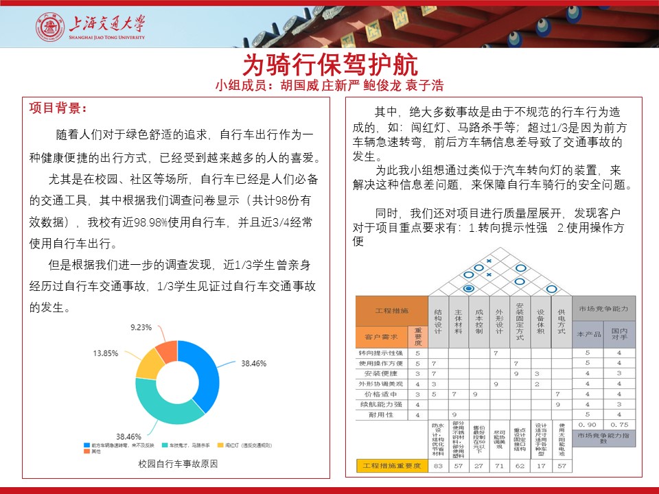 根据质量屋展开,我们发现用户对于转向灯提升性强以及使用方便提出了强烈的要求。为此,我们项目的主要目的是实现自行车转向灯的自动性开关,并且保证只是的精确性和醒目性,解决目前市场上,自行车转向灯操作不方便以及指示情况不准确等问题。实现人脸检测功能,对于用户的骑行情况进行判断。最终,可能与手机app实现软硬件结合,来降低产品成本,以及优化产品与用户之间的信息交互。
