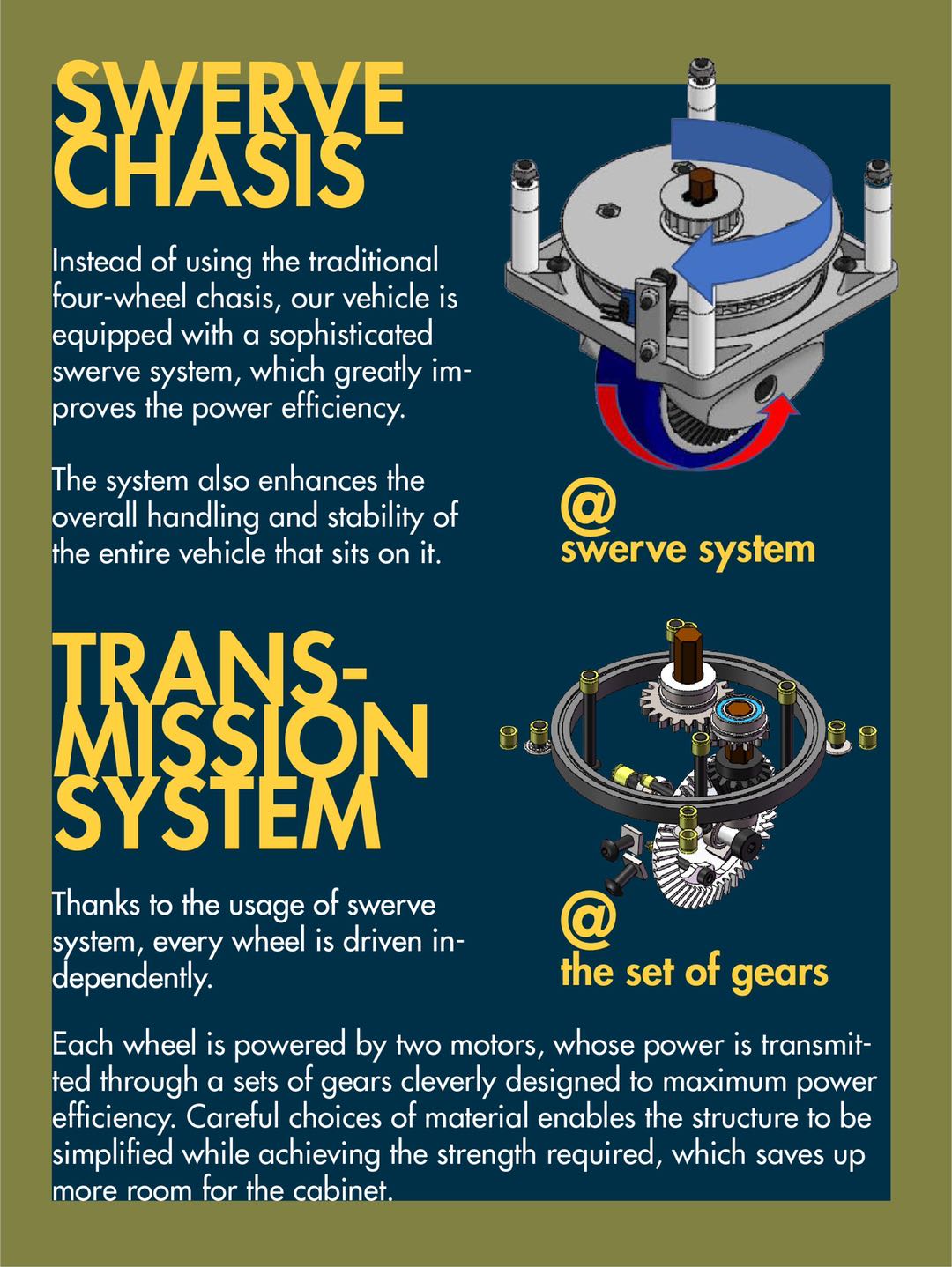 自动快递车作为一种新型的快递工具,可以解决当下快递的暂存问题,同时代替大量人力消耗。各大物流公司也在着手开发自动快递车,但目前已有的设计大多仍停留在概念阶段,普遍存在移动不灵活,容易磕碰等问题,无法在居住小区等实际环境下有效推广。针对居住区路线复杂、障碍物多的道路特点,我们小组希望着重小车底盘的设计,结合矢量底盘的机械原理,并设计相应的控制程序,使得小车可以在平面内做到全角度、全功率运行。