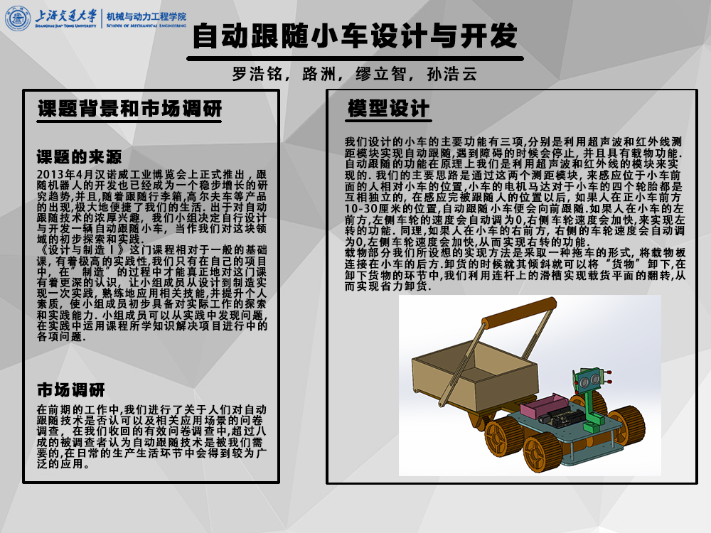 我们的主要目标是利用Arduino的主板加上超声波测距模块和红外传感器模块来实现我们所需要的自动跟随功能,并且用独立的四个马达控制车轮转动,这样的设计可以让我们的自动跟随小车感应到被跟随物品在他前方的位置,与此同时,也通过逻辑判定实现了遇到障碍自动停止的功能。除此之外,我们还要让我们的自动跟随小车具有载物的功能,在载物部分使用了连杆和滑槽的结构设计,让我们在卸货环节可以使载货平台实现一个倾倒的功能。