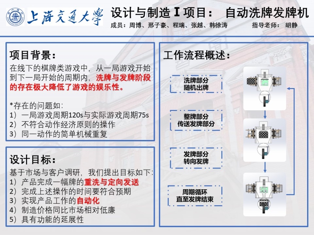 本组制造产品的最理想状态是可以完成一幅斗地主扑克牌的重洗与发送过程。将最终目标按阶段分解后可得到如下主要目标: