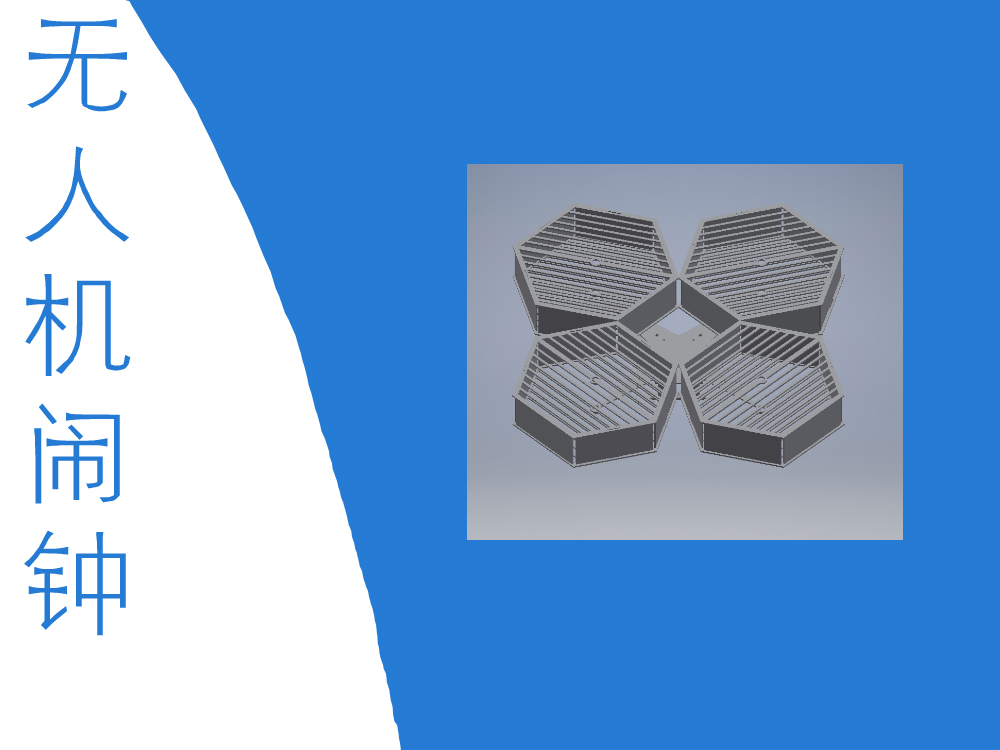 本项目的主要目标是设计一套无人机-闹钟系统,包含底座和无人机两个部分。根据设想,底座承担闹钟的主要功能,无人机作为关闭闹钟的控制部分。到设定时间,闹钟响起,无人机起飞悬停,用户必须将无人机关闭放回底座,闹钟才会关闭。底座同时为无人机提供充电功能。无人机应当具备廉价、安全、防摔等特点。安全是最重要的,为此设计了格栅避免用户手指碰触旋翼受伤,格栅能阻止一般人手指伸入,且旋翼距离上下表面很远,即使能部分伸入也难以碰到旋翼,确保了安全性。