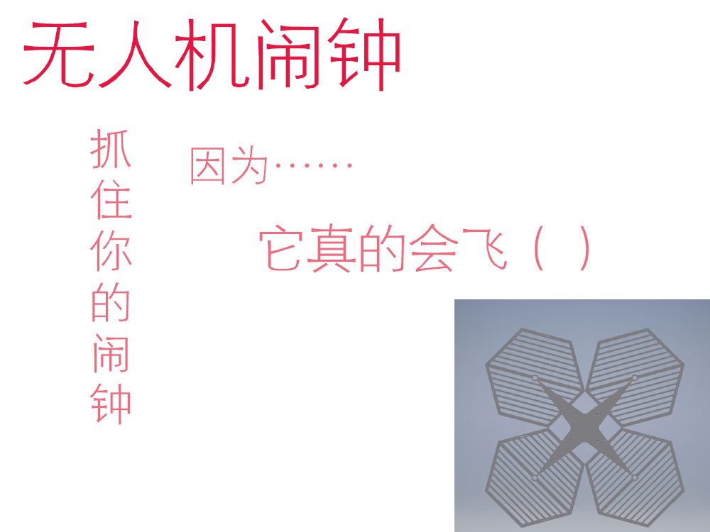 本项目是为解决起床困难而设计的一种闹钟。根据问卷及自身经验,传统闹钟存在容易关闭,不利于起床的问题。结合自身的兴趣,我提出了无人机闹钟的设想,期望通过抓取无人机这一行动,迫使用户起身活动,降低关闭闹钟后继续睡觉的可能,有助于解决起床困难。另外,由于无人机闹钟也具有一定趣味性,价格较普通闹钟更高时对年轻的消费者也有较好的吸引力。