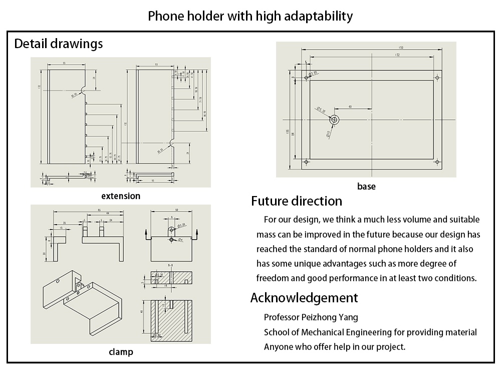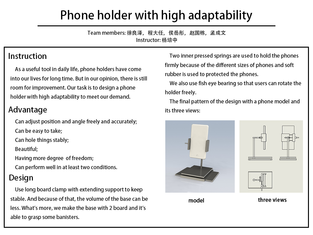 Mobile phone has become an indispensable part of people's life. In the online course of this semester, due to the need of recording video for the PE class and invigilating the online examination, the team members had tried a variety of mobile phone holders, and found that there are various problems in the use of mobile phone holders in the market. Therefore, we have the idea of designing a mobile phone holder.