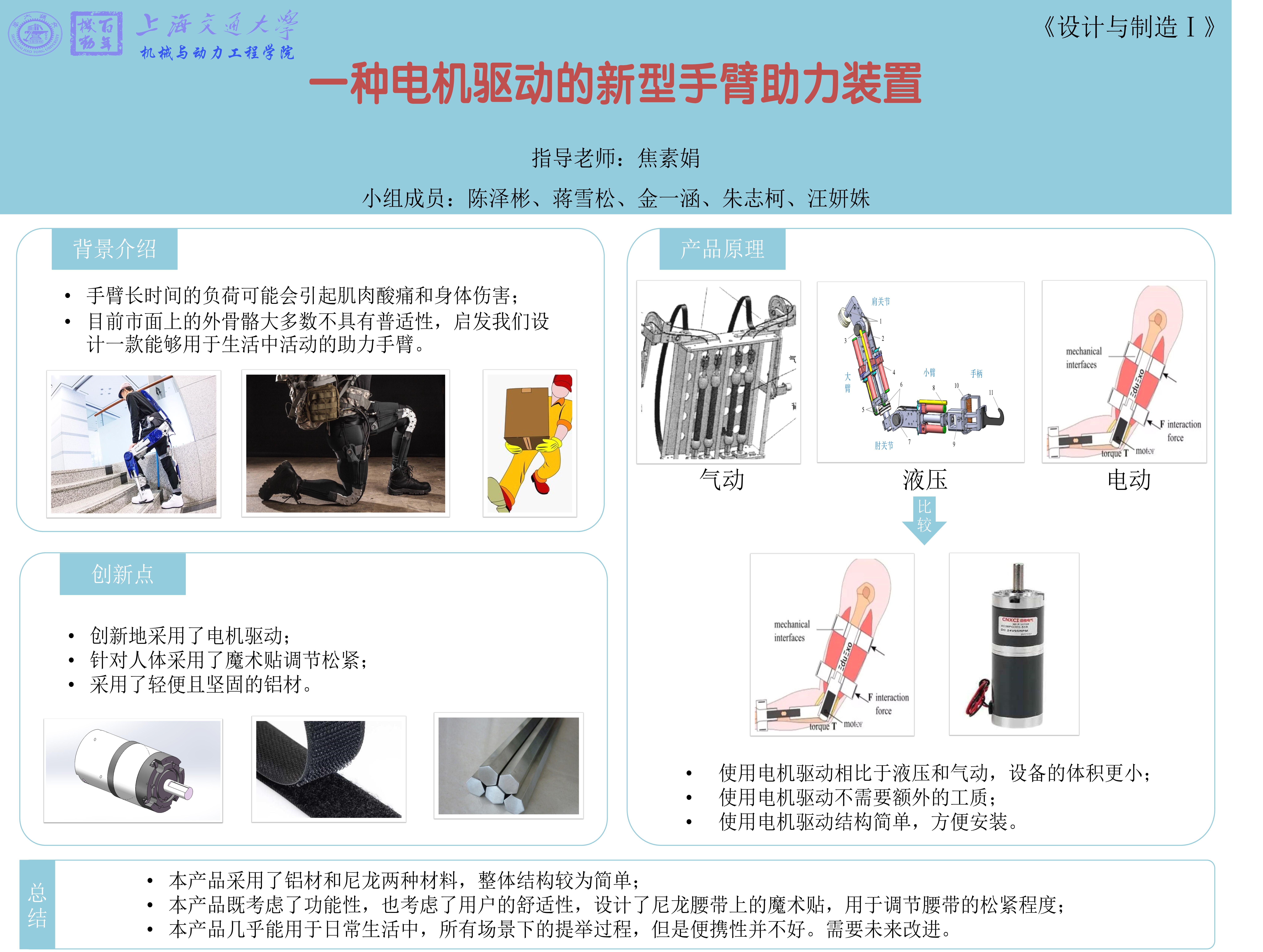 我们小组计划设计一款基于人体上肢运动机理和杠杆原理,满足上肢关节位置控制和人机协调动作控制的手臂助力器。该设计使用尼龙带包裹身体,通过杆等连接部件将物品对人的作用力传导到穿戴者的背部及腰部,对集中力进行分散处理,并且加以电机辅助提供扭转力矩,为穿戴者提供支撑、运动辅助的力量。