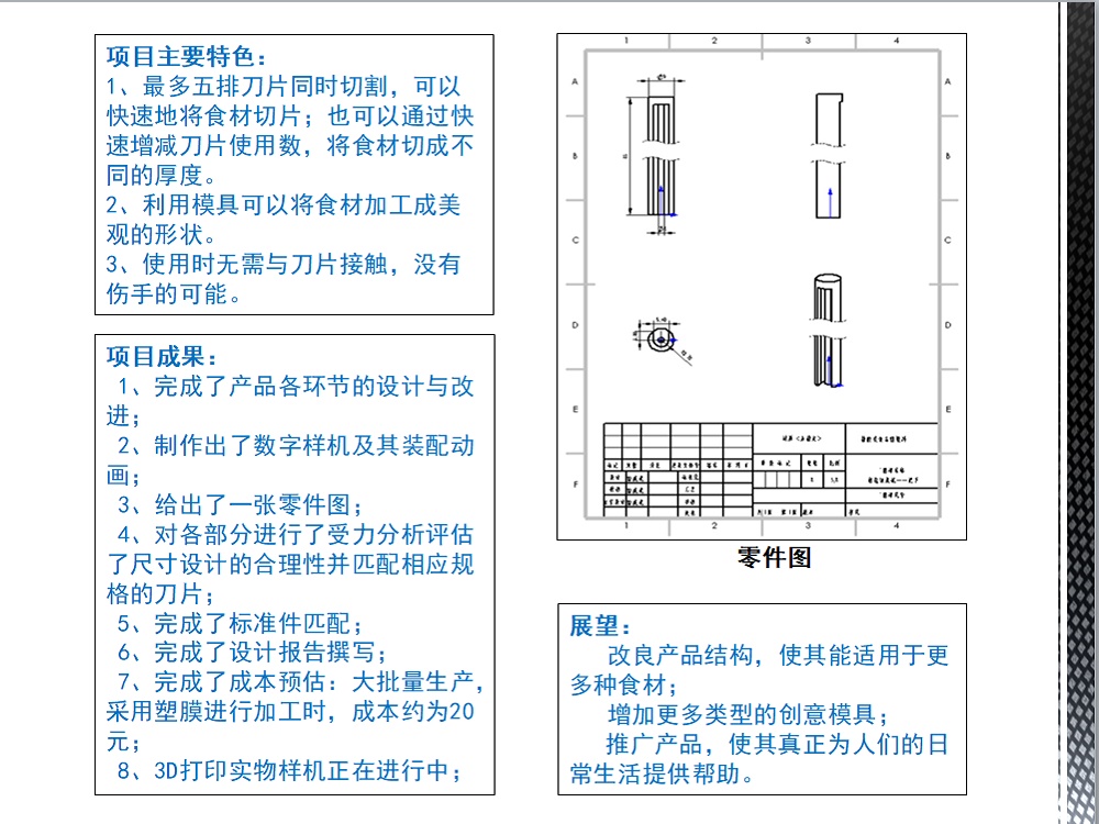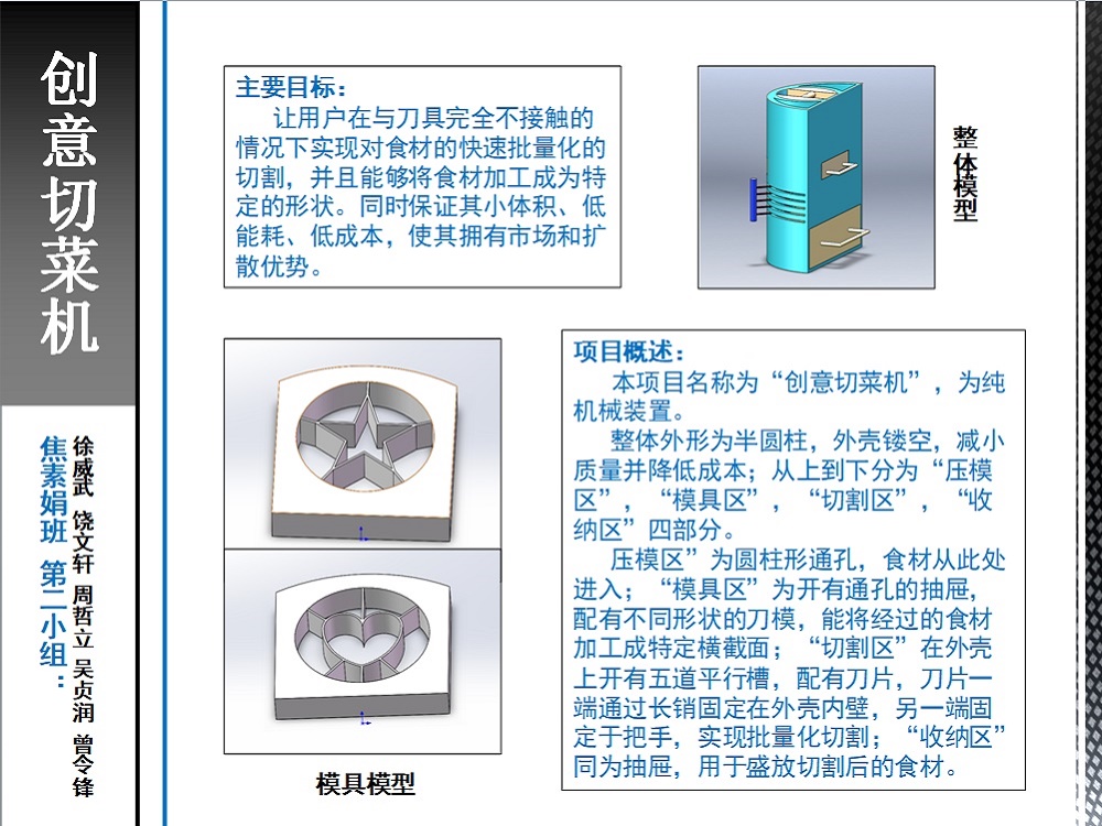 本项目名称为“创意切菜机”,为纯机械装置。整体外形为半圆柱,外壳镂空,减小质量并降低成本;从上到下分为“压模区”,“模具区”,“切割区”,“收纳区”四部分,“压模区”为圆柱形通孔,食材从此处进入;“模具区”为开有通孔的抽屉,配有不同形状的刀模,能将经过的食材加工成特定横截面;“切割区”在外壳上开有五道平行槽,配有刀片,刀片一端通过长销固定在外壳内壁,另一端固定于把手,实现批量化切割;“收纳区”同为抽屉,用于盛放切割后的食材。