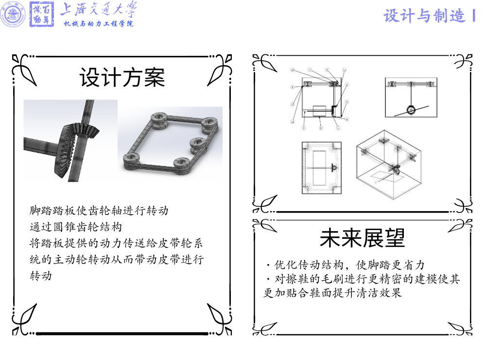 我们设计的通过脚踏提供动力擦除鞋面灰尘的鞋面清洁盒,制造的数字样机能初步满足功能需求。脚踏式鞋面清洁盒的外形为能容纳下单只鞋子的长方体,在鞋盒底部设置一块与齿轮轴固连的踏板,在进行脚踏时提供动力,通过一套圆锥齿轮传动装置带动侧面的皮带轮主动轮运动,进而带动皮带转动,皮带内侧附有一圈能够把鞋面完全包裹的毛刷,对鞋面进行清洁,且踏板上有小毛刷,在脚踏时通过微小移动可实现对鞋底的清洁。