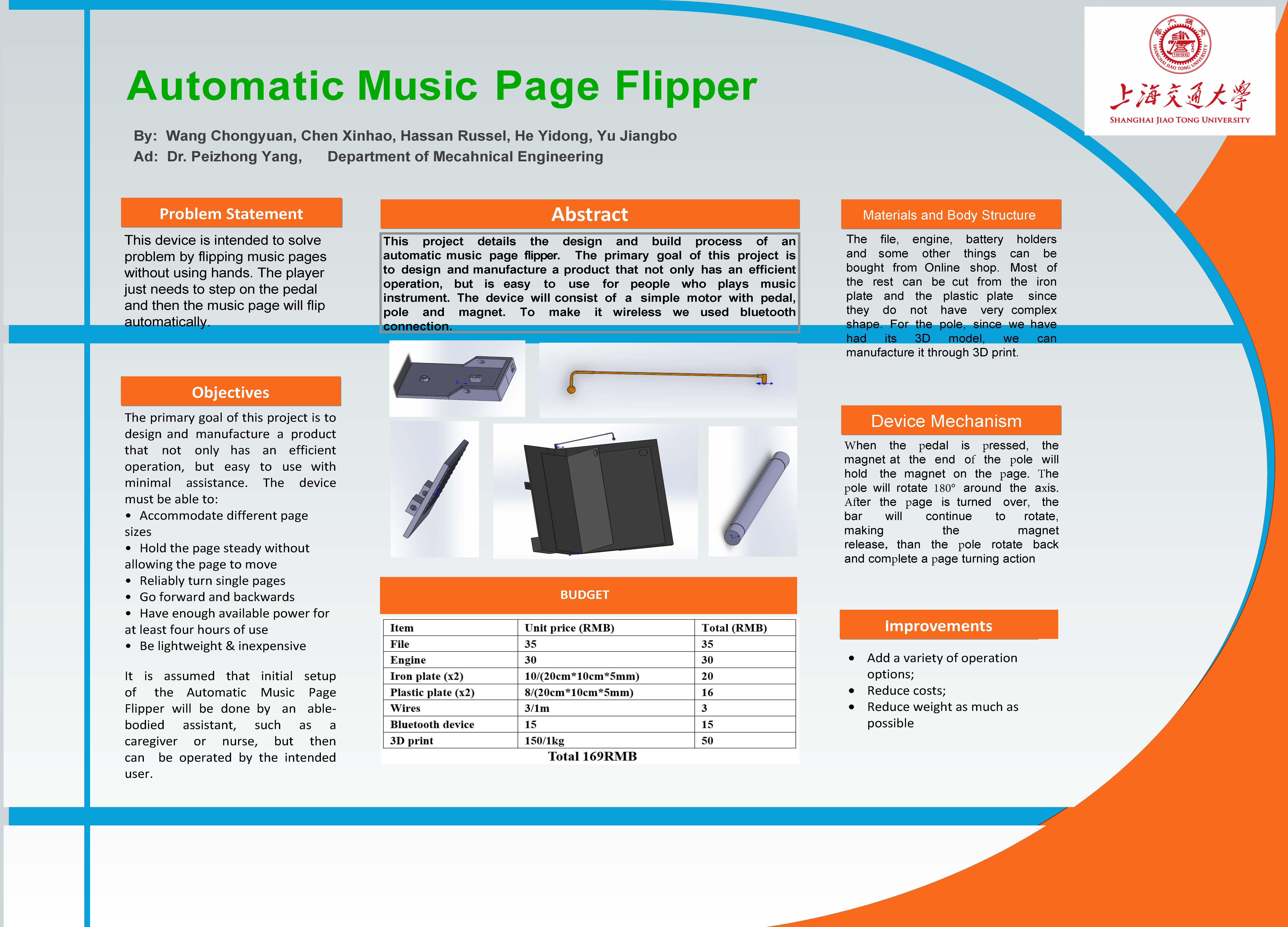 Our product successfully achieves the main targets and solves the problem. It can accommodate different page sizes, hold the page steady without allowing the page to move, turn single pages reliably, turn forward and backwards and have enough available power for at least four hours of use. Moreover, it only costs 169RMB to make one. It’s certain that the cost can still decrease, while prices of other products having the same function are ranging from 400 to 1500RMB. Since power are provided by Battery No.5 and button cell, there is no need to recharge and the project can be used whenever users want.