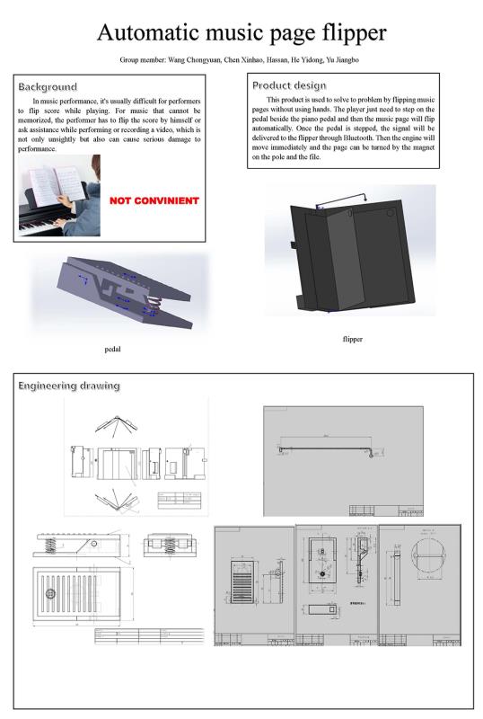 This product is used to solve to problem by flipping music pages without using hands. The player just needs to step on the pedal beside the piano pedal and then the music page will flip automatically. Once the pedal is stepped, the signal will be delivered to the flipper through Bluetooth. Then the engine will move immediately and the page can be turned by the magnet on the pole and the file.