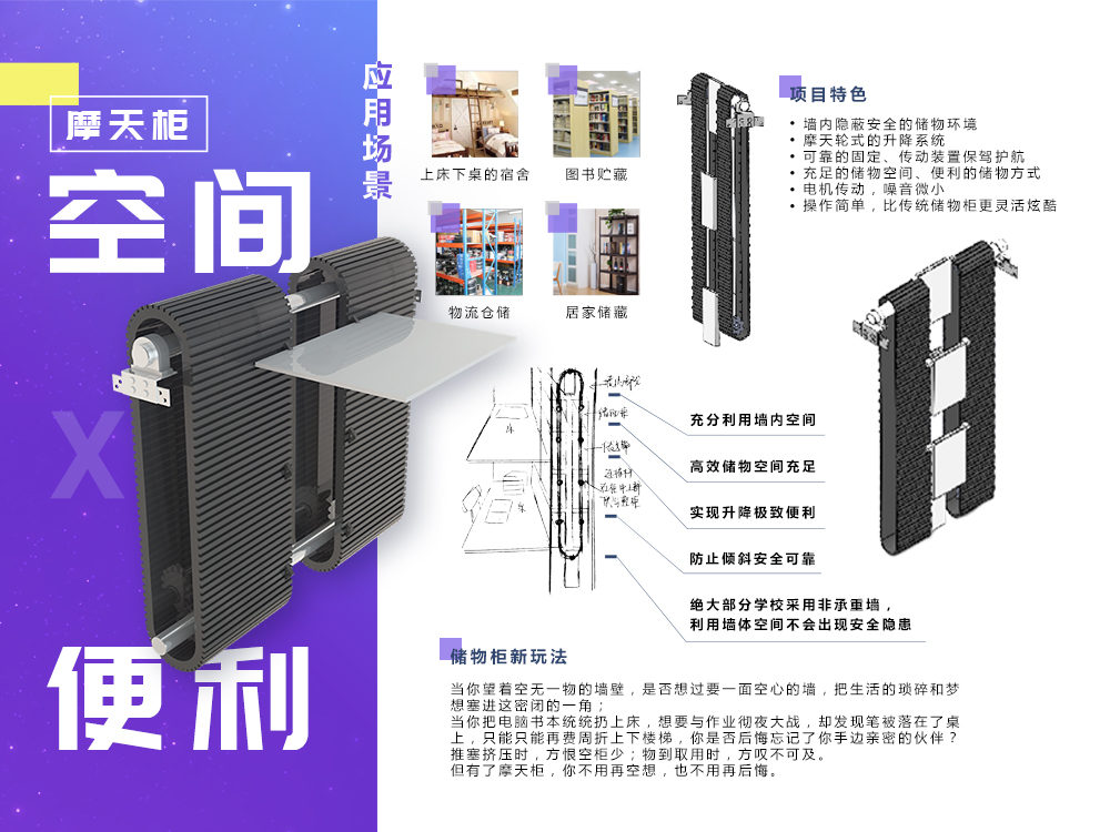 “摩天柜”是以摩天轮为灵感原型、以大学生多人制宿舍储物不便为背景创作出的可移动墙体内置柜。