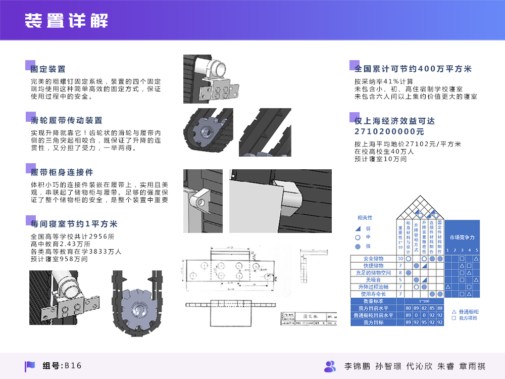 项目希望通过以“摩天柜”的形式,利用墙体内部空间,从而实现宿舍储物空间的扩增,增加寝室可储物面积,提高寝室的空间利用率,方便大学生生活;同时其移动功能可以帮助大学生在上床下桌的取放物,并且由于内置柜的特性增强了大学生的储物隐秘性,保护大学生的隐私和财产安全。同时从长远看,摩天柜的大力推行还可以节省高校土地资源,带来巨大的经济效应。