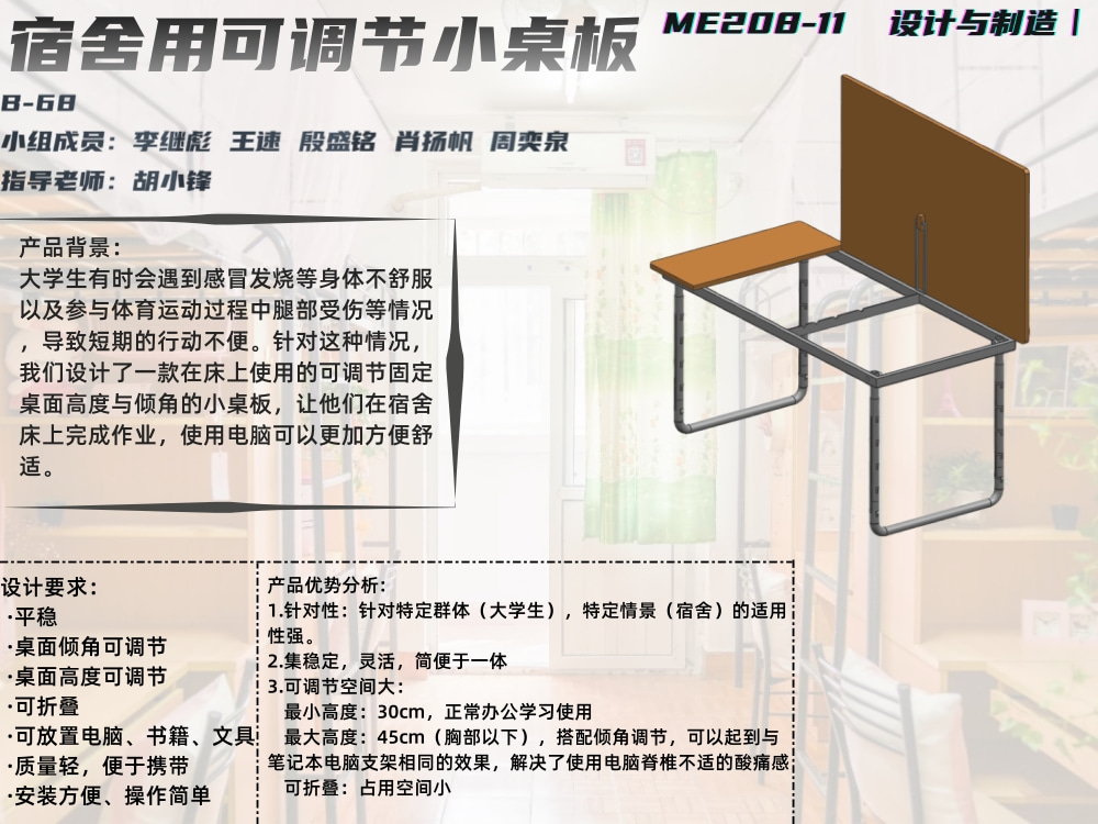 大学生有时会遇到感冒,发烧等身体不舒服,以及参与体育运动过程中腿部受伤等情况,导致短期的行动不便。而当前市面上额小桌板存在牢固和灵活方面的问题,不能满足他们在床上的学习办公需求,针对这种情况,我们为大学生群体设计了一款在床上使用的可调节固定桌面高度与倾角的小桌板,在追求灵活性的同时也不失牢固性,让他们在宿舍床上完成作业,使用电脑可以更加方便舒适.