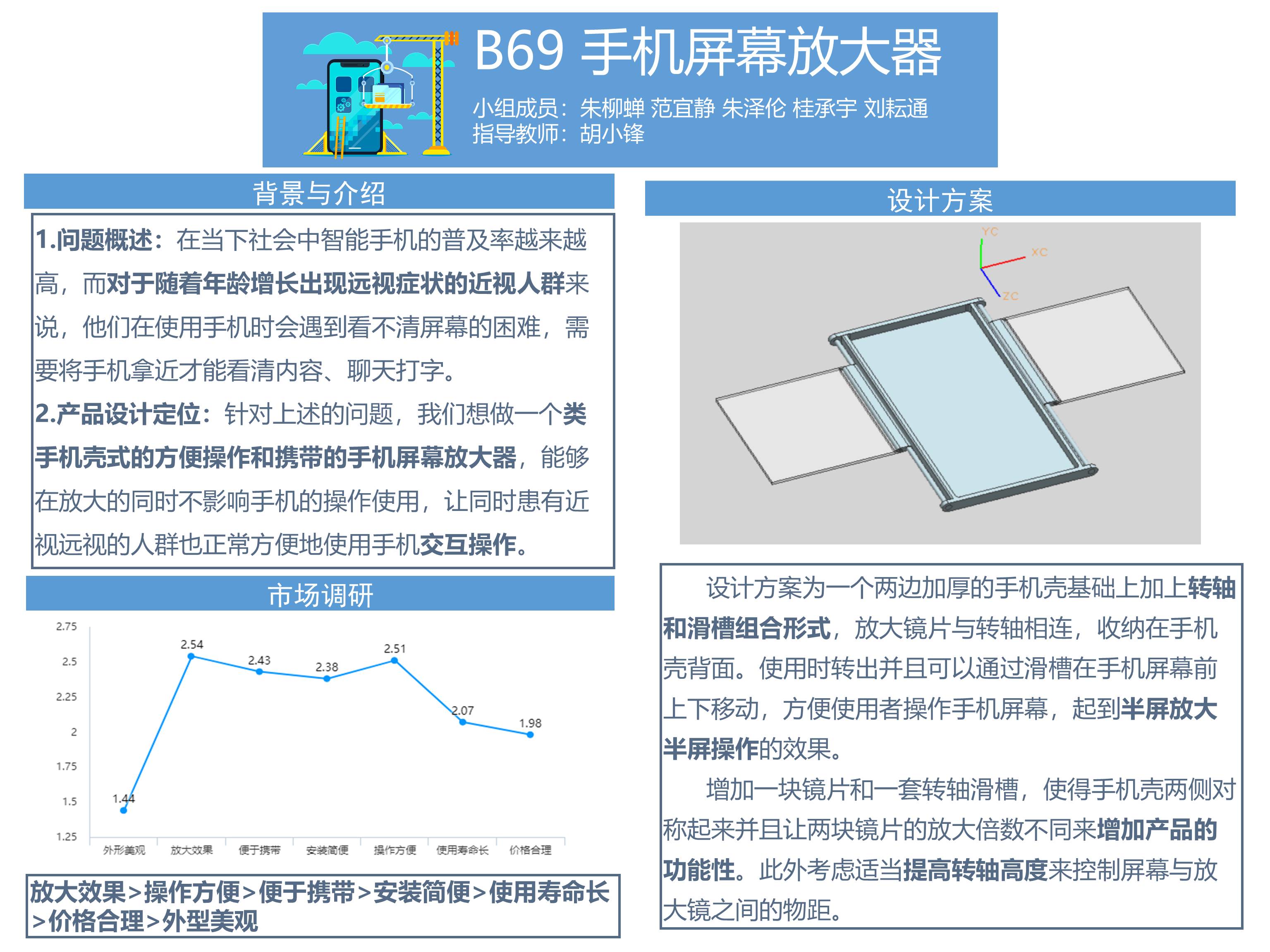 针对上述提出的问题,我们希望设计一款“类手机壳式的手机屏幕放大器”。通过合理简易的机械结构与凸透镜片,将装置与正常的手机壳结合,在方便携带、不影响人们日常使用习惯、不影响美观度的情况下,让同时患有近视远视的人群也能和视力5.2的人一样正常方便地使用手机交互操作,为他们的生活提供便利。