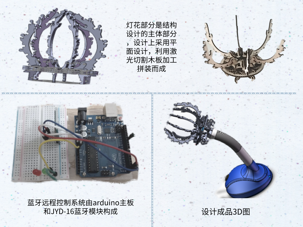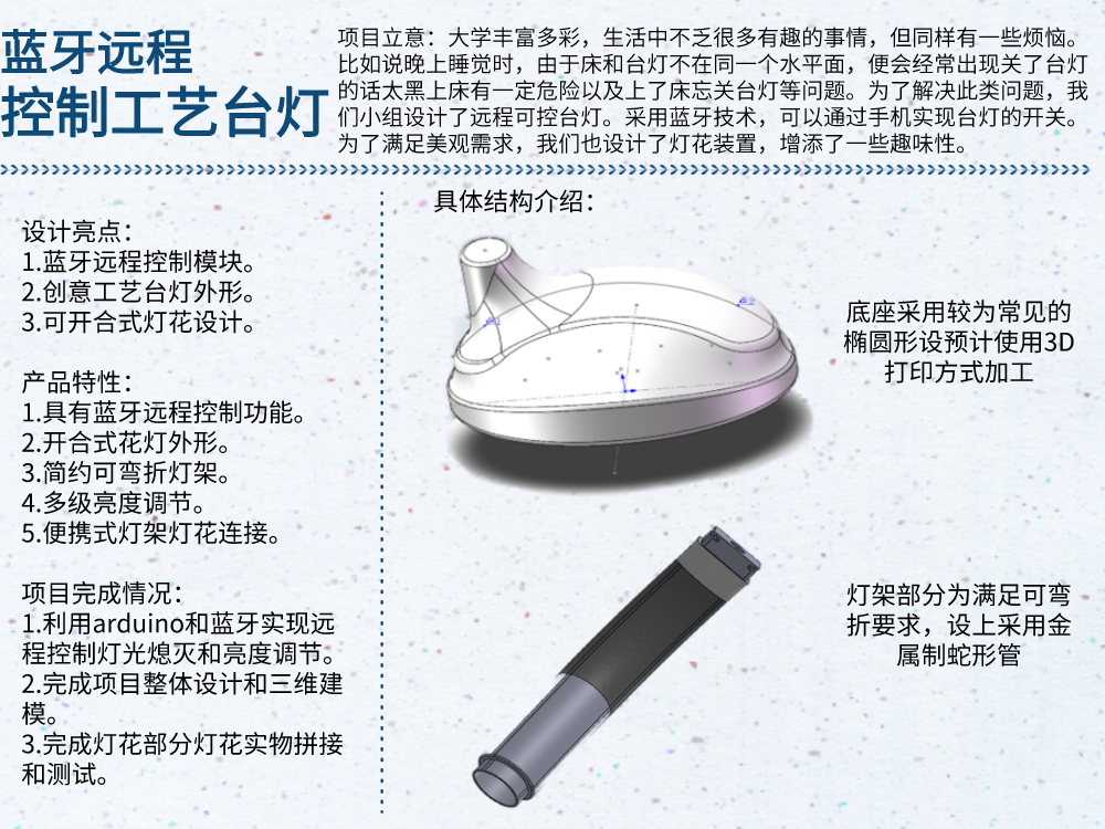本项目采用了蓝牙技术,利用Arduino主板和JYD-16蓝牙模块构成蓝牙远程控制系统,实现了手机APP远程控制台灯的开关和台灯亮度的三级调节。台灯结构方面,底座采用常见的椭圆形设计,灯架部分为满足可弯折要求采用了金属制蛇形管,并完成了项目整体设计和三维建模,得到了项目成品的3D效果图。灯花部分采用平面设计,利用激光切割技术加工木板,并完成了实物拼接与开合结构测试。