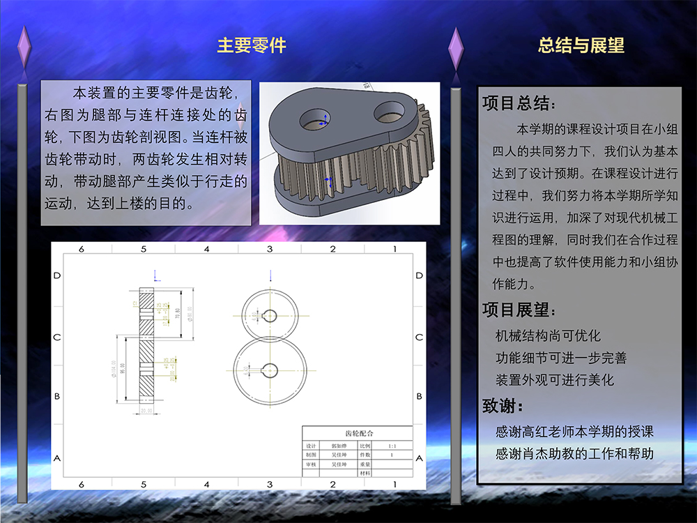 我们小组完成的多地形自动运输篮以机械传动结构实现了在平地和楼梯上进行搬运货物的功能。该机器运用齿轮啮合结构带动不同部位的旋转,使腿部结构进行圆周运动,模拟人行走时双腿的运动,以实现搬运货物的功能。同时制作一个具有可伸缩且可拆卸的篮子,以达到装载不同体积物品的目的,不使用时还可以进行折叠来节省空间。能够在不同程度上满足学生、白领、工人等不同身份的人的不同需求,如拖行李箱上楼、去菜场买菜、搬运极重的物品等。