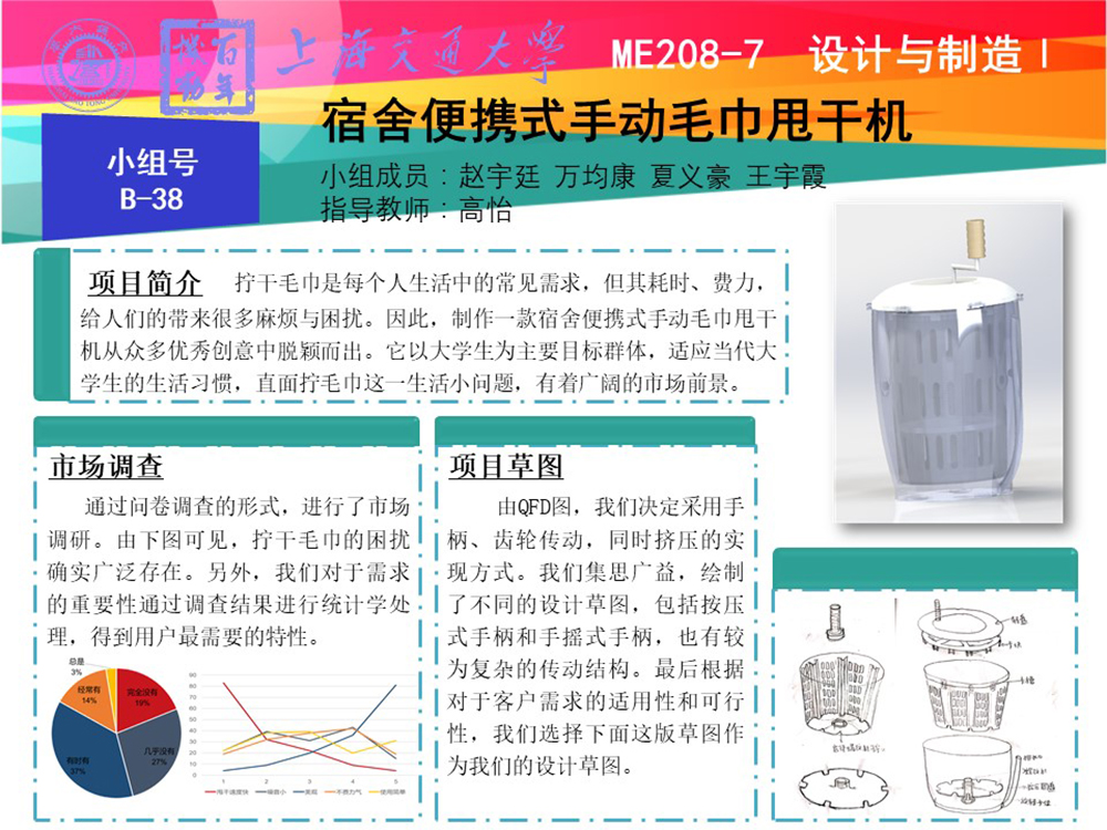 我们通过需求确定、基础设计、后期改进,以及加工分析,完成了此次项目的产品——宿舍便携式手动毛巾甩干机。这一款产品,针对宿舍的毛巾甩干问题而提出,目标受众明确,有市场前景。它能通过旋转、挤压结合的方式,快速甩干毛巾,且使用便捷。此外,它小巧玲珑,方便存储,适宜寝室使用。我们对它进行了后期的加工、成本、市场分析。我们的这一项目,过程严谨,成果丰富;我们还加入了许多富有创新性的元素,使其成为一款新颖的、优秀的产品。