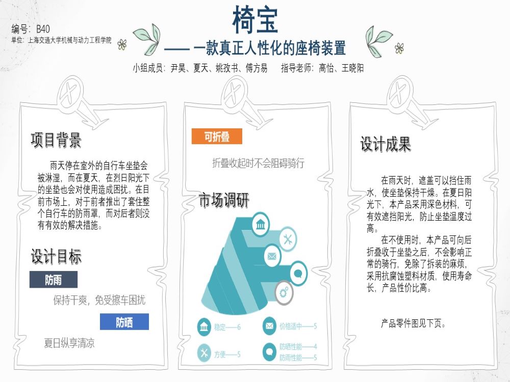 考虑到现在市场上的自行车没有自带的防雨防晒功能,使得晴雨天坐没有车棚的自行车出行十分不方便,因此想设计一个结构简便、实用性强、价格合理的自行车座保护装置,以保护自行车座,方便人们出行。本项目设计的“椅宝”主要为实现自行车座的防雨防晒功能,同时在实现以上功能的前提下实现自由收放,不影响骑行,并使得结构尽可能简单,操作方便,与此同时,考虑到受众的可接受价格不会很高,所以在可行范围内降低成本。另外,为适应不同车型,实现固定可调节以达到较高的普适性。