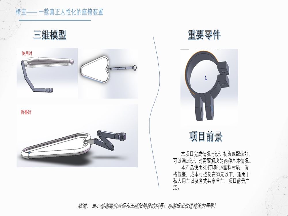 经过市场调研、确定设计方案,我小组最终完成了成品的3D模型绘制。在考虑了实用性、可操作性以及适配性的前提下,我们设计的“椅宝”能基本发挥预想的作用。在下雨天时,遮盖可以挡住雨水,使自行车凳保持干燥;在夏日阳光下,本产品采用深色不透明材料,可以有效遮挡阳光,防止自行车凳的温度过高。在不使用自行车时,本产品可以向后折叠收于坐垫之后,不会影响正常的骑行,从而免除了拆装的麻烦。另外,其成本也较低,可以适用于各类私人自行车甚至共享单车,项目有较好的前景。