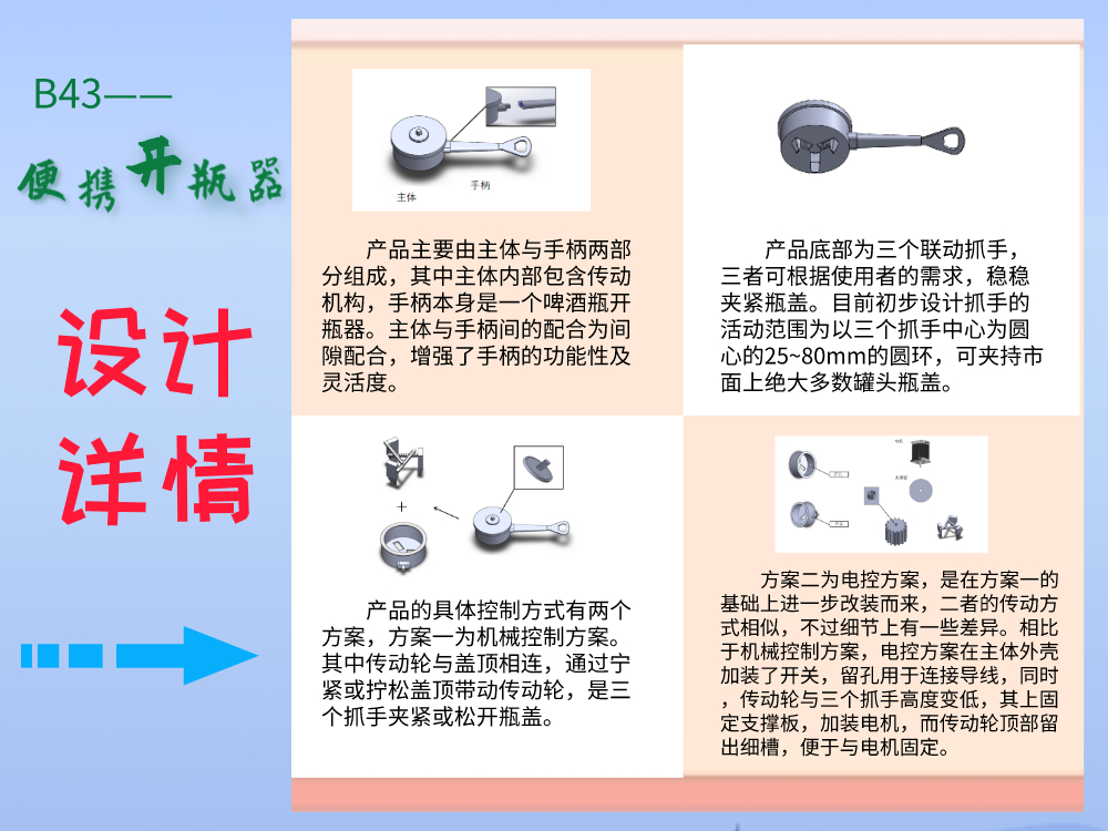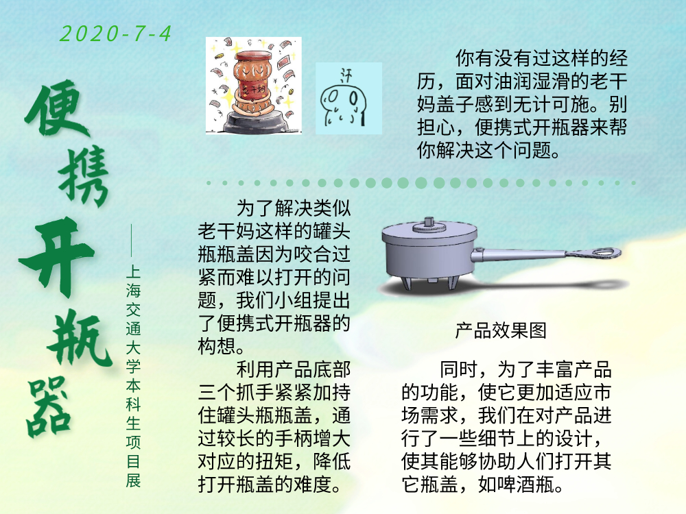 罐头、瓶子等方便的食物储存容器是生活中随处可见的日用品,大多数人在生活中开盖的频率都非常高。而为了保存时的密封良好,罐头盖与瓶盖往往设计要求紧密连接,甚至直接相连。当手上没有合适的道具时,人们往往就会遇到开盖的问题。对此我们小组设计了一款便携式的开瓶器,能提供给使用者轻松的开盖方式,又体积小巧便于携带。通过转动齿轮,可以拉动齿条,调节三个抓手的位置以夹紧物件,再旋转手柄(保证扭动手柄时,夹持更紧密),以顺利旋出盖子。