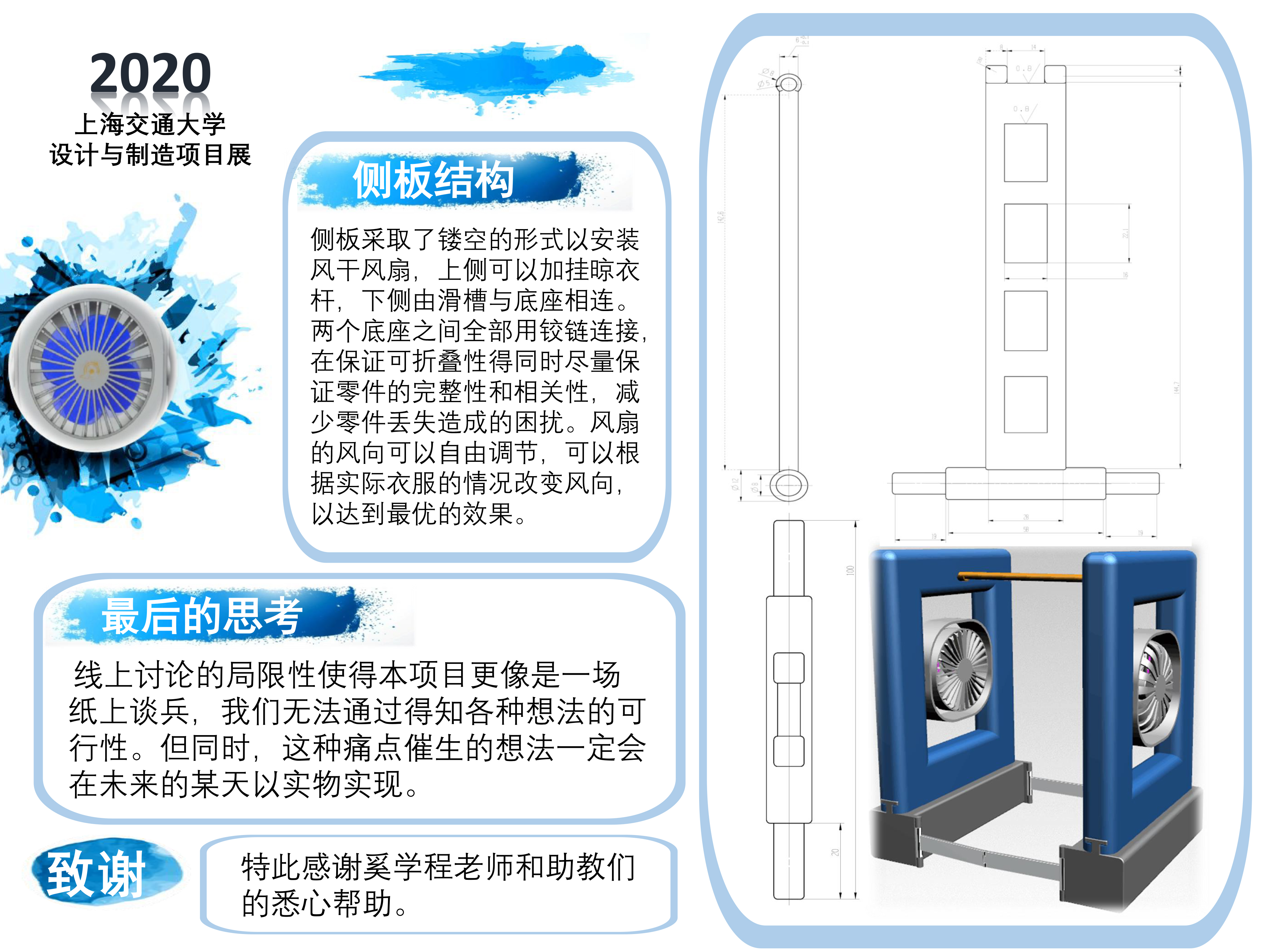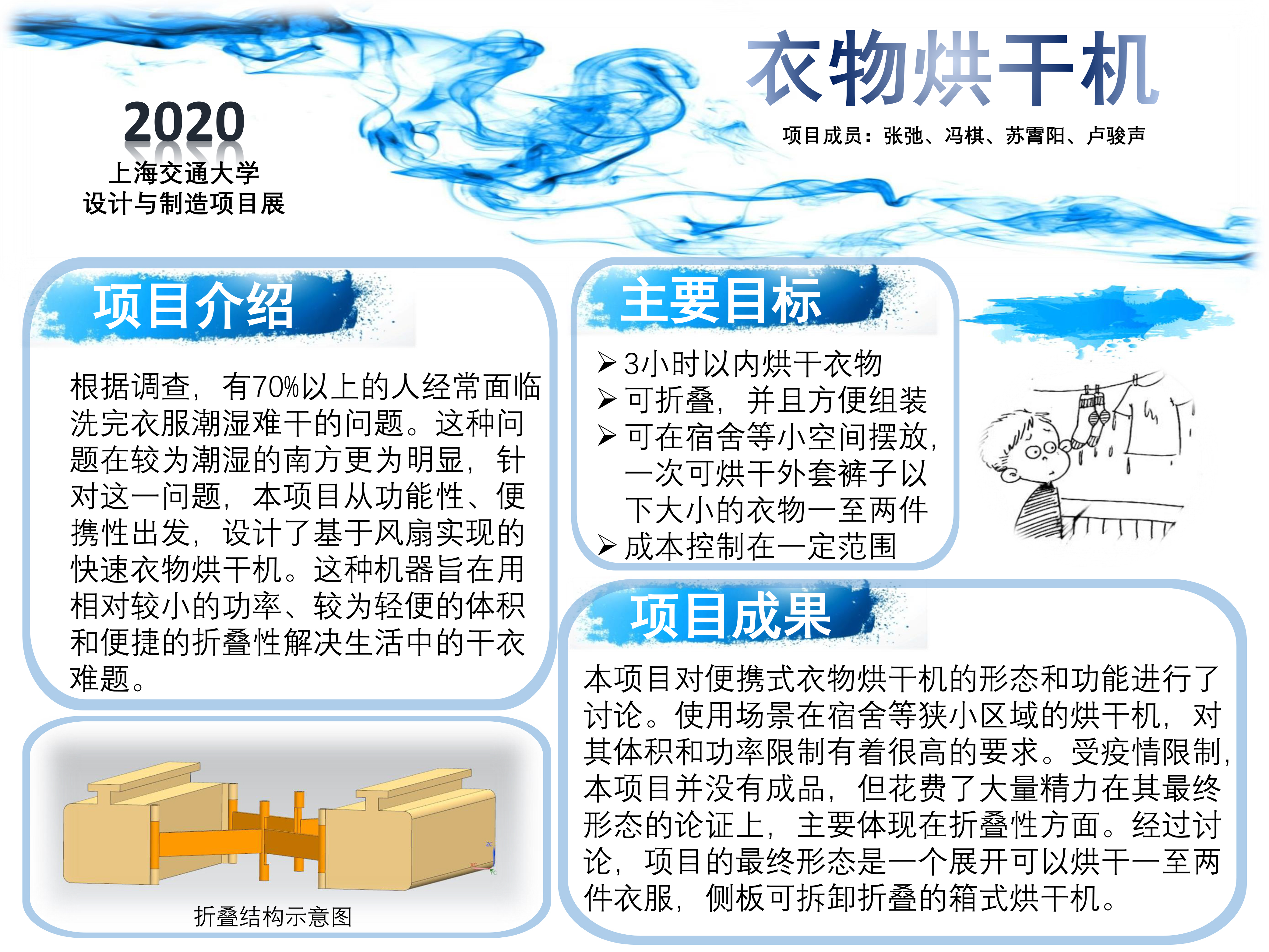 本项目对便携式衣物烘干机的形态和功能进行了讨论。使用场景在宿舍等狭小区域的烘干机,对其体积和功率限制有着很高的要求。受疫情限制,本项目并没有成品,但花费了大量精力在其最终形态的论证上,主要体现在折叠性方面。经过讨论,项目的最终形态是一个展开可以烘干一至两件衣服,侧板可拆卸折叠的箱式烘干机。项目最后对成品进行了建模和运动仿真,对其最终形态做出了较为详细的描述。