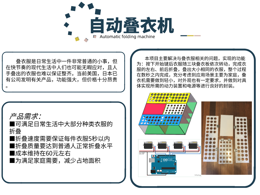 叠衣服是日常生活中一件非常普通的小事,但在快节奏的现代生活中人们也可能无暇应对,且人手叠出的衣服也难以保证整齐。当前美国,日本已有公司发明有关产品,功能强大,但价格十分昂贵。为应对此种情况,本小组设计出了能自动叠衣服的机器,实现了“一键叠衣”的功能,只要将衣服放上机器并按下开始键,一件衣服就会在数秒之内折叠玩成,具有叠衣效率高、操作简单、体积小等特点,不仅可以用于普通家庭的日常生活中,也可以用在服装厂,服装店等场合,减少人工操作。