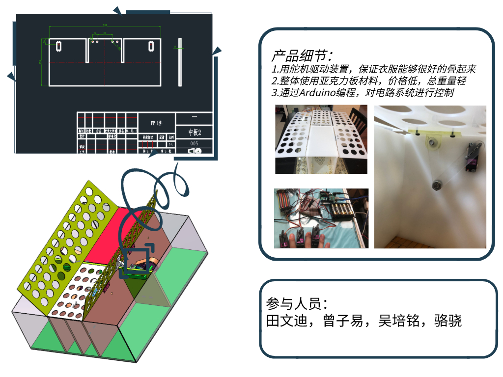 项目中期完成了大部分的结构设计,项目后期做了适当修改。目前机器所需的零件结构,板材等均已加工完毕并到货。电控方面采用Arduino板,相关的舵机程序也已实现,电源开关等均到货并完成电路连接,舵机运转正常。项目后期零件,板材的组装均完成,并通过调试调整了部分结构,现在已经可以完全实现目标功能。此外,测试表明,项目产品的叠衣效果较好,可承受不同衣物的重量,结构比较坚固。目前尚未完成的主要是整体的封装。同时,产品在体积、成本等方面有改进的空间。
