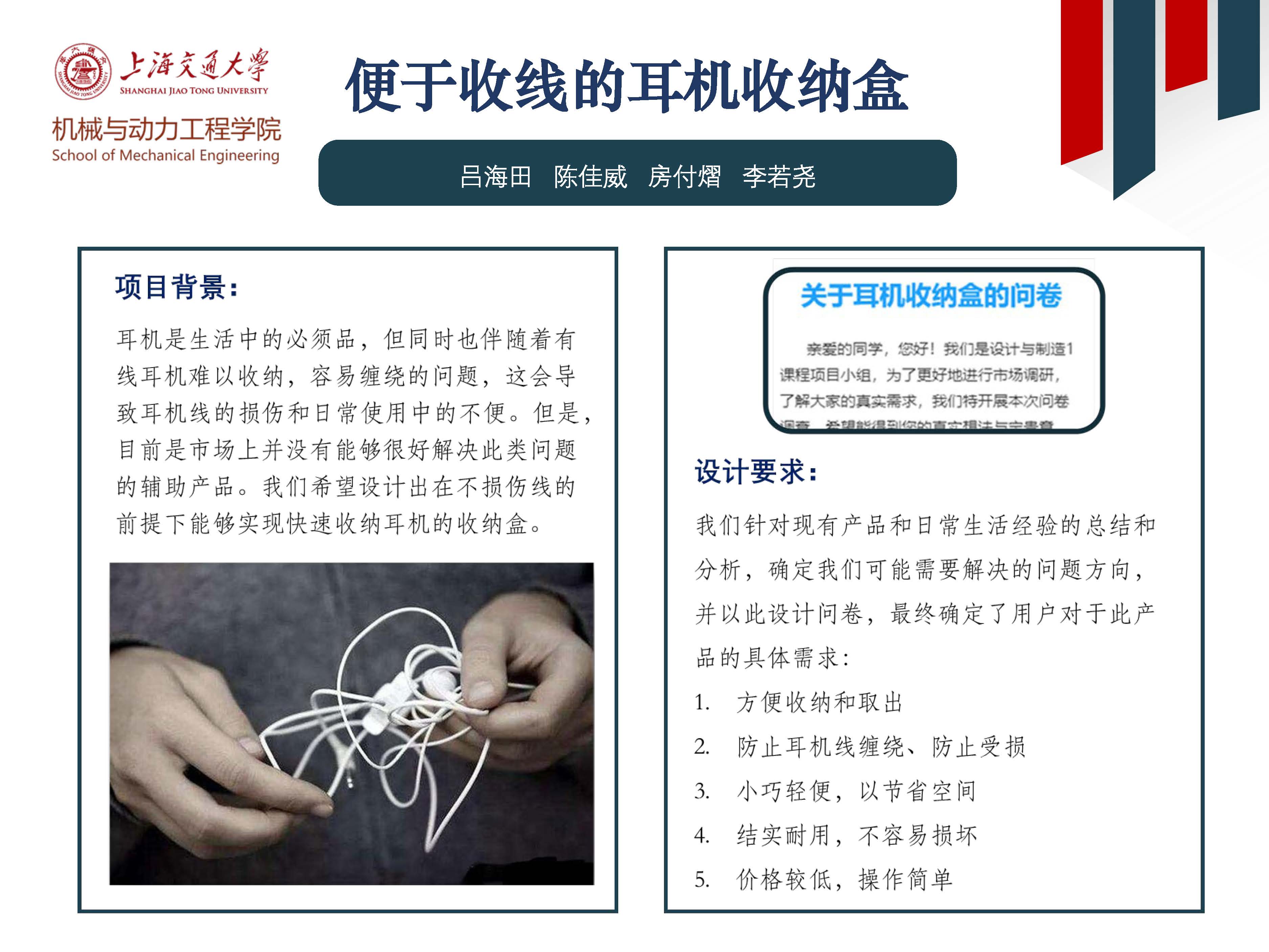 根据客户需求调查和质量功能展开,本小组主要针对耳机收线难的问题设计一种可以简便收线过程的同时保护线不受损伤的装置。首先设计合理的动力装置和传动装置,以达到方便收取线、防缠绕和小巧轻便的客户需求,同时设计包括外壳、绕线柱在内的其它零件,使之符合QFD给出的开槽、传动系数大和轴直径大的工程特征。在完成零件整体设计后,根据力学分析验证方案的合理性,并给出包括3d模型、材料和工艺在内的完整结构和加工方案,并完成其市场性的检验。