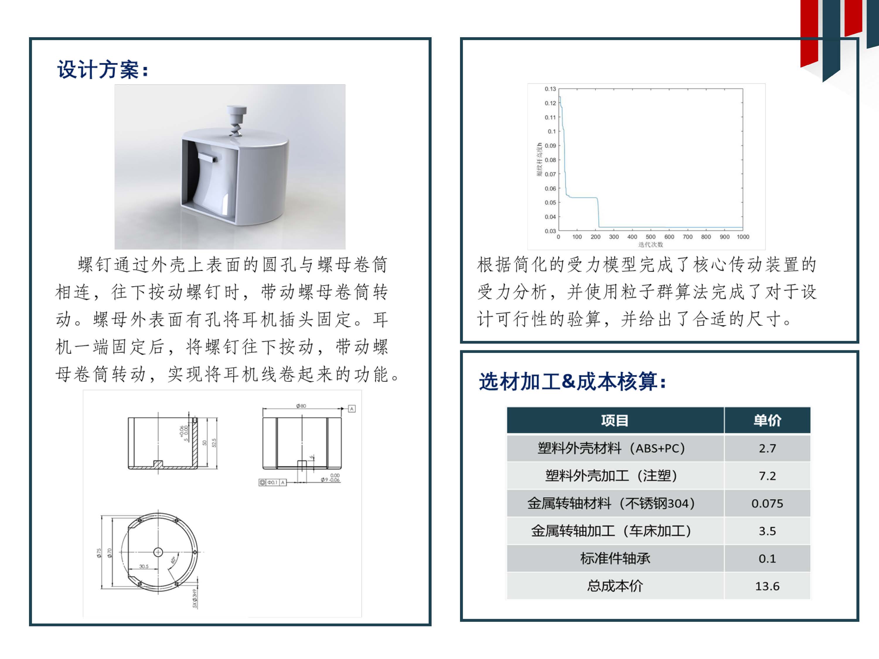 生活中耳机的使用越来越多,同时也伴随着有线耳机难以收纳,容易缠绕的问题。本组设想了一个易于收纳耳机线的装置。经过前期用户需求调研和质量功能展开,确定对于本产品最重要的客户需求和工程特征;据此,针对动力源与传动方式的不同,本组提出了7种设计方案,并最终选择螺纹式作为首选方案;再由简单力学分析与粒子群启发式算法计算,验证了方案的可行性;最后,本组使用solidworks为主的3d建模软件,完成了整体3d建模。同时选择材料和加工工艺,并完成了成本核算,验证了其市场化的前景。