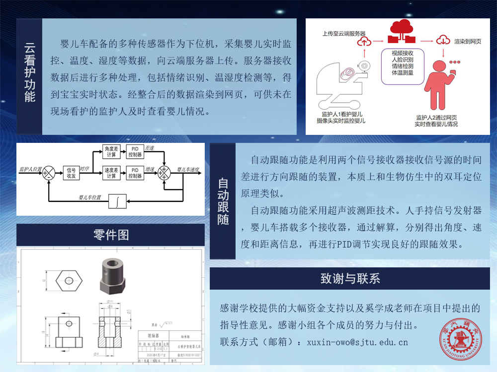 云看护智能婴儿车是以0~2岁婴儿的妈妈作为目标用户,通过3D建模构建,电控系统辅助运动、AI算法辅助看护的一个创新型集成产品。我们通过摄像头和红外测温装置实现对婴儿数据的采集,对婴儿的实时视频进行人脸识别和情绪分析,最后将数据信息汇总渲染到网页上,孩子的父母可以实时查看婴儿的状况。此外,我们还侧泳超声波测距技术,通过对监护人信号的采集实现跟随功能,即监护人可以解放双手,避免了用手推或者拉婴儿车。