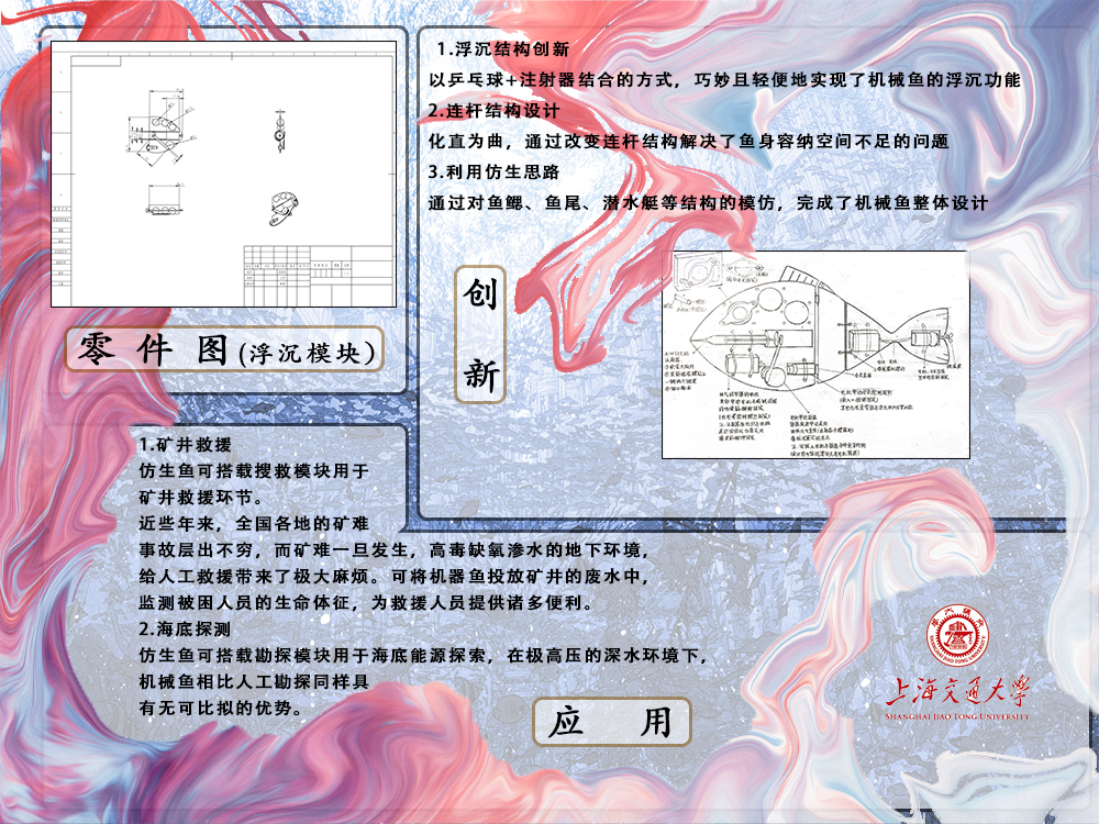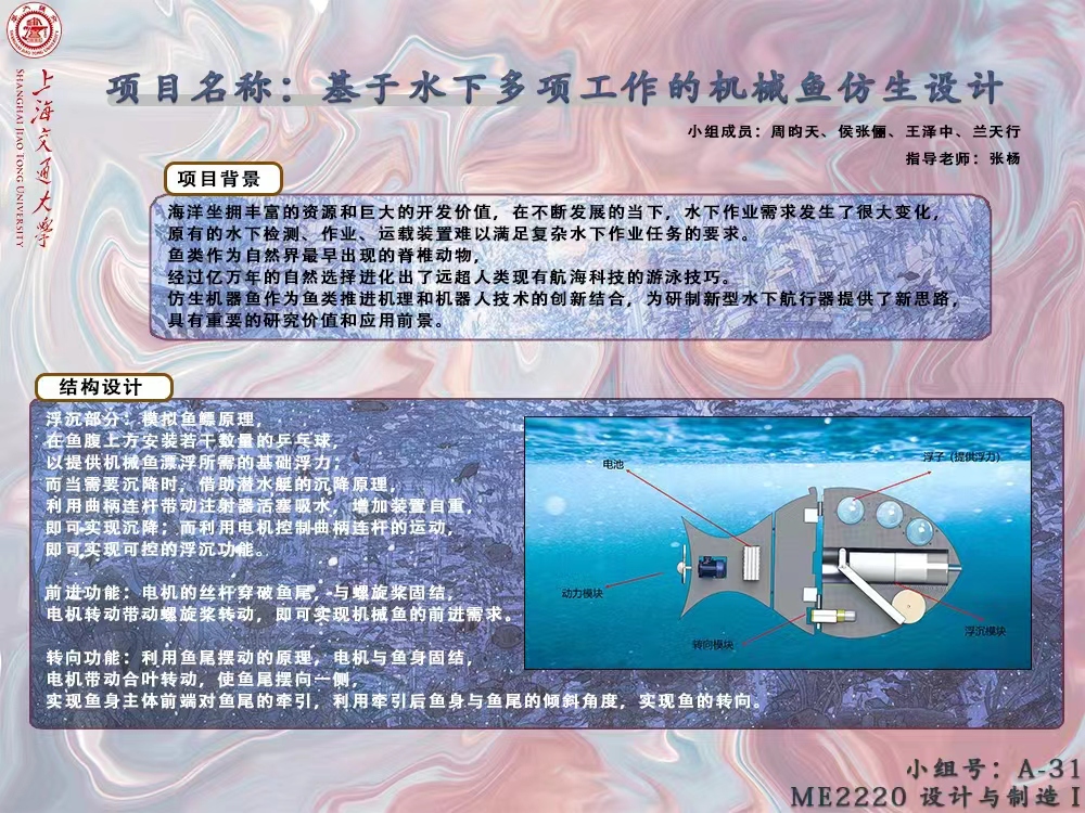 我们小组的项目是基于水下多项工作的机械鱼仿生设计。机械鱼主体由木板和亚克力板组成;利用乒乓球等轻质浮子材料为机械鱼提供浮力,实现漂浮功能;模拟潜艇原理,利用特制曲柄连杆带动注射器推拉实现机械鱼的浮沉功能,利用数节电机驱动合页、助推器控制机械鱼的转向、摇摆、前进等运动,初步实现手动遥控机械鱼在水中的各项运动,并计划实现机械鱼在水中的自动游行,还可通过搭载水下地质探测、水质检测等模块实现水下多项工作。
