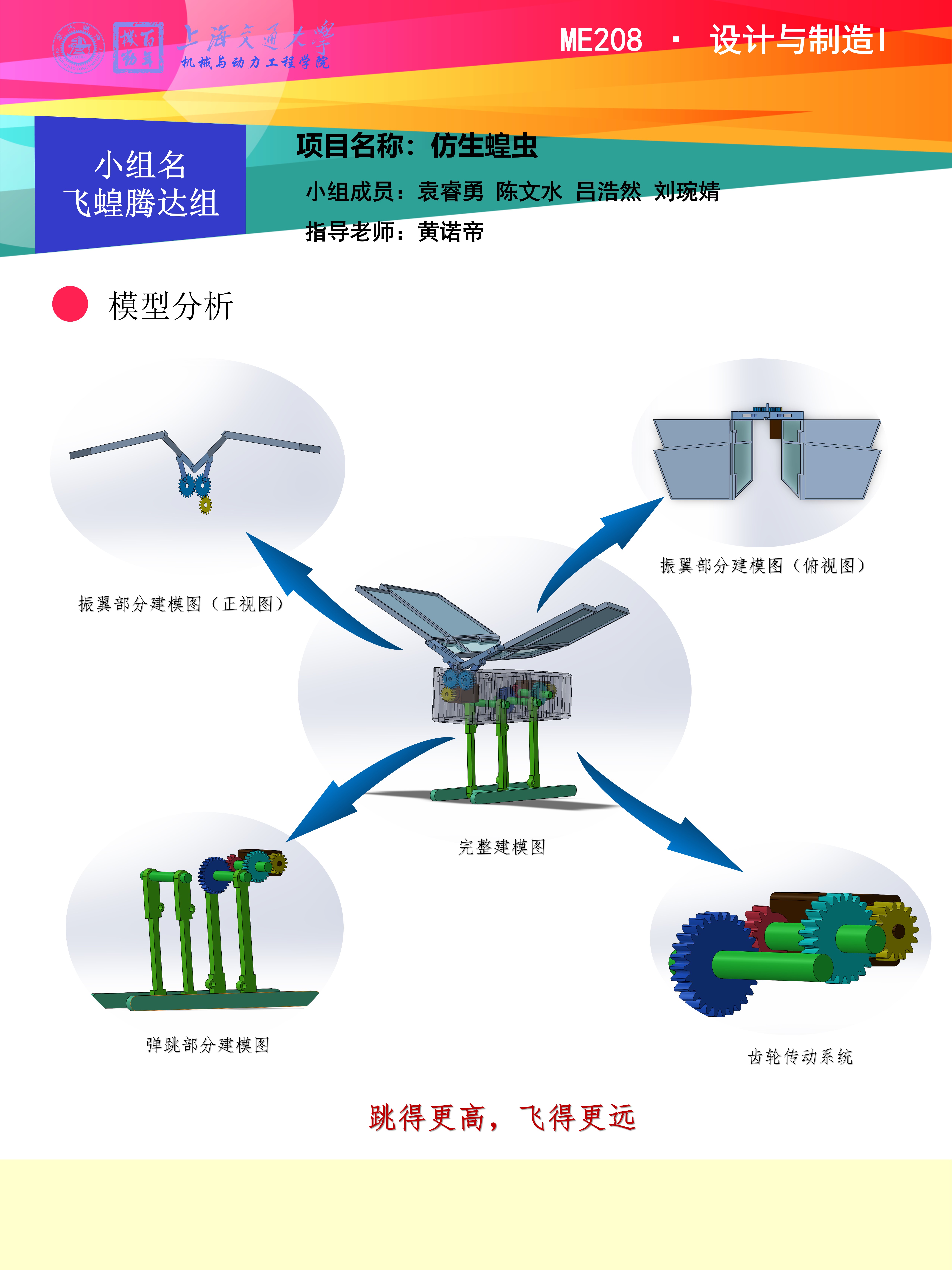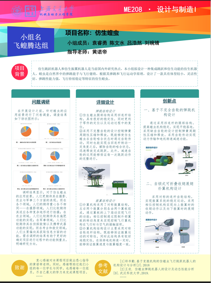 仿生蝗虫,是基于自然界蝗虫而设计的一款仿生机械。其主要装置包括力源装置、力源传输机构、腿部四连杆机构、可折叠收翅展翅扑翼机构、相位控制器和一个外壳:力源装置提供动力来源;力源传输机构将动力输送到腿部四连杆机构和扑翼机构;腿部四连杆机构利用动力与弹簧来实现弹跳的功能;扑翼机构采用了对称振翼结构,通过翼板的上下扇动实现飞行的功能;相位控制通过限制翼板的转动角度来实现控制飞行翼机构与空气的接触面积。