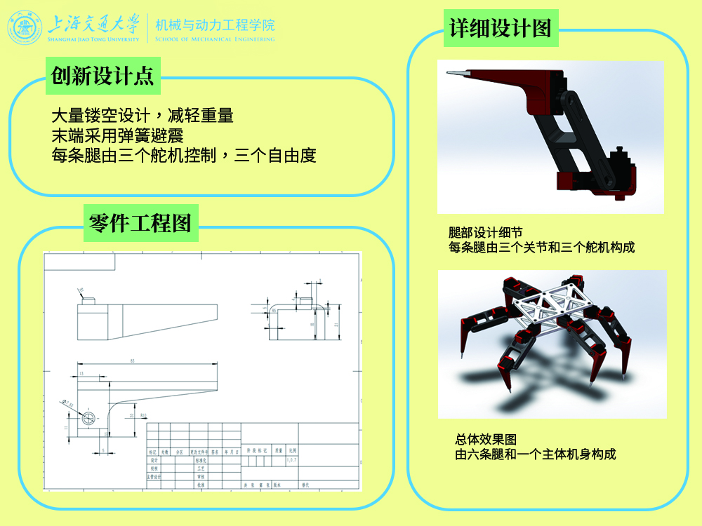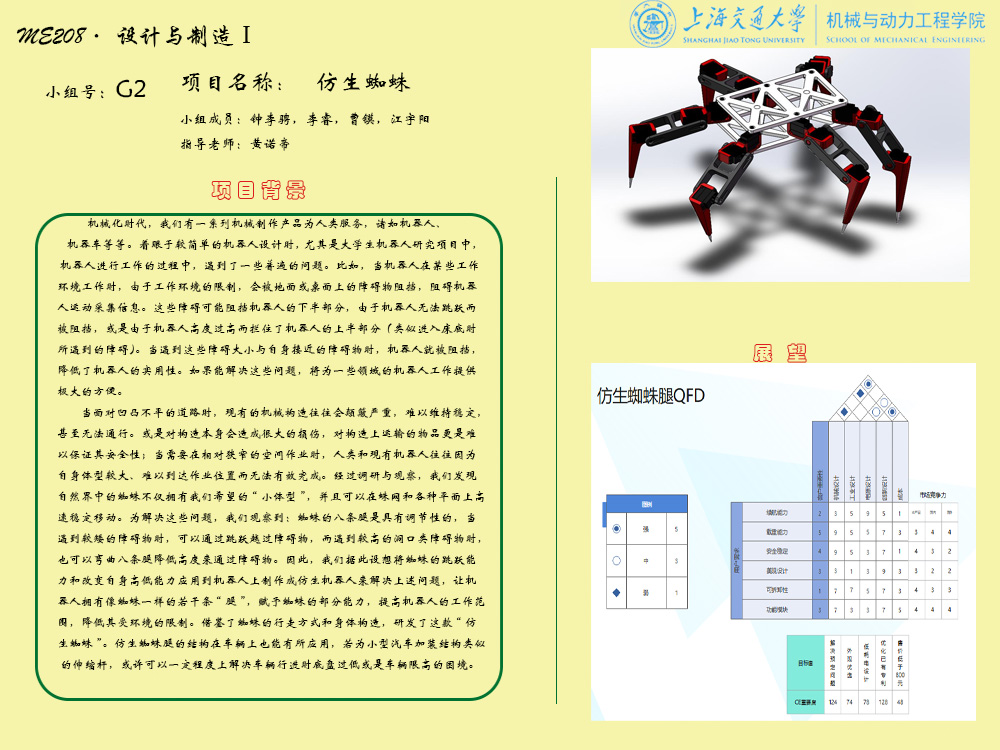 受到仿生设计理念的启发,我们设想将蜘蛛的跳跃能力和高低能力应用到机器人上制作成仿 生机器人来解决工程上机器人跨越障碍物的问题,提高机器人的工作范围,降低其受环境的限制。我们选用机电结合的驱动方式,依靠齿轮等传动结构仿生了六条由一个关节扭合成的蜘蛛腿结构,并在蜘蛛腿末端创新性地加入内置弹簧结构,使机器人具有一定弹跳能力,扩大机器人的伸缩范围和克服障碍能力。