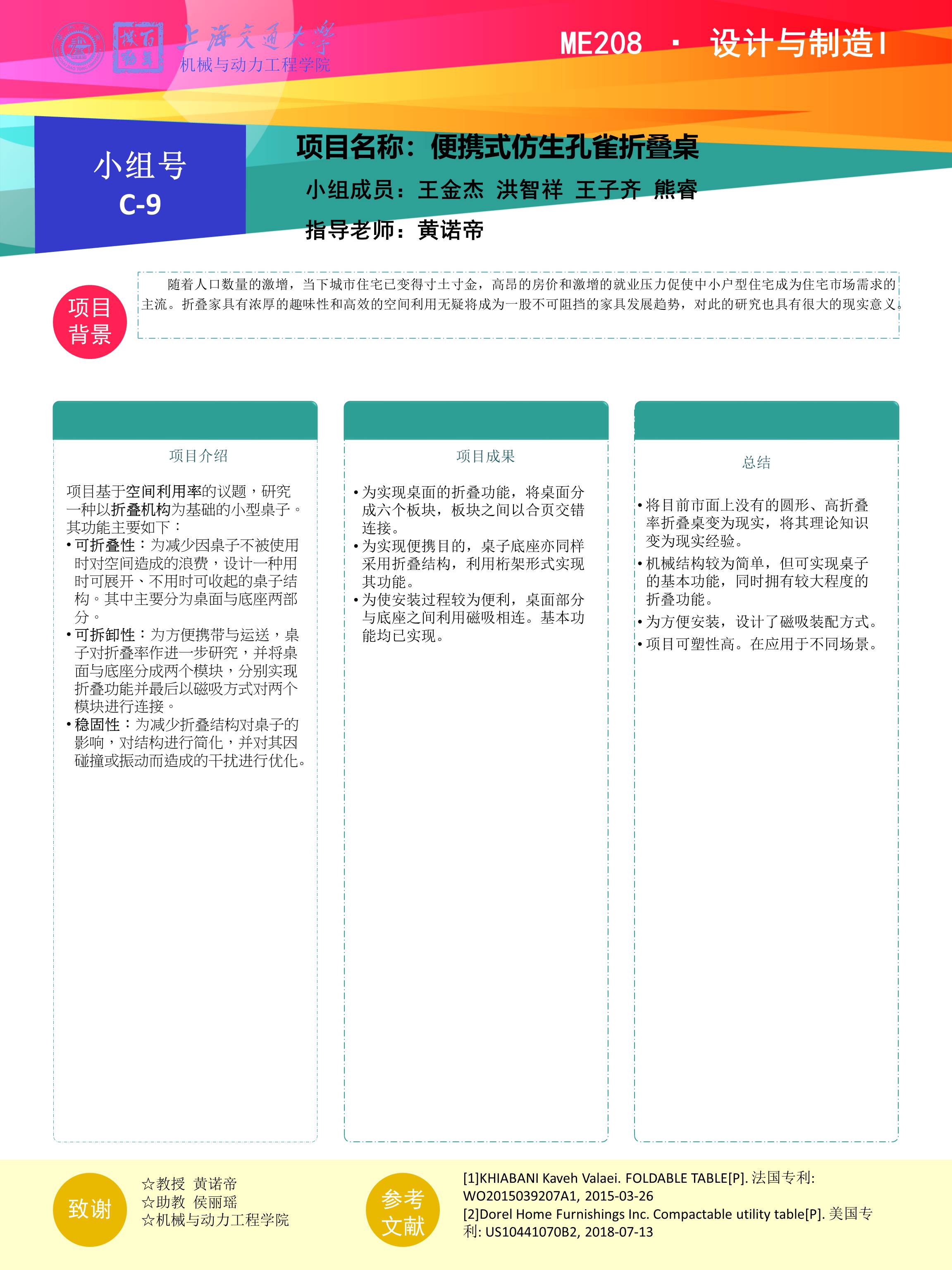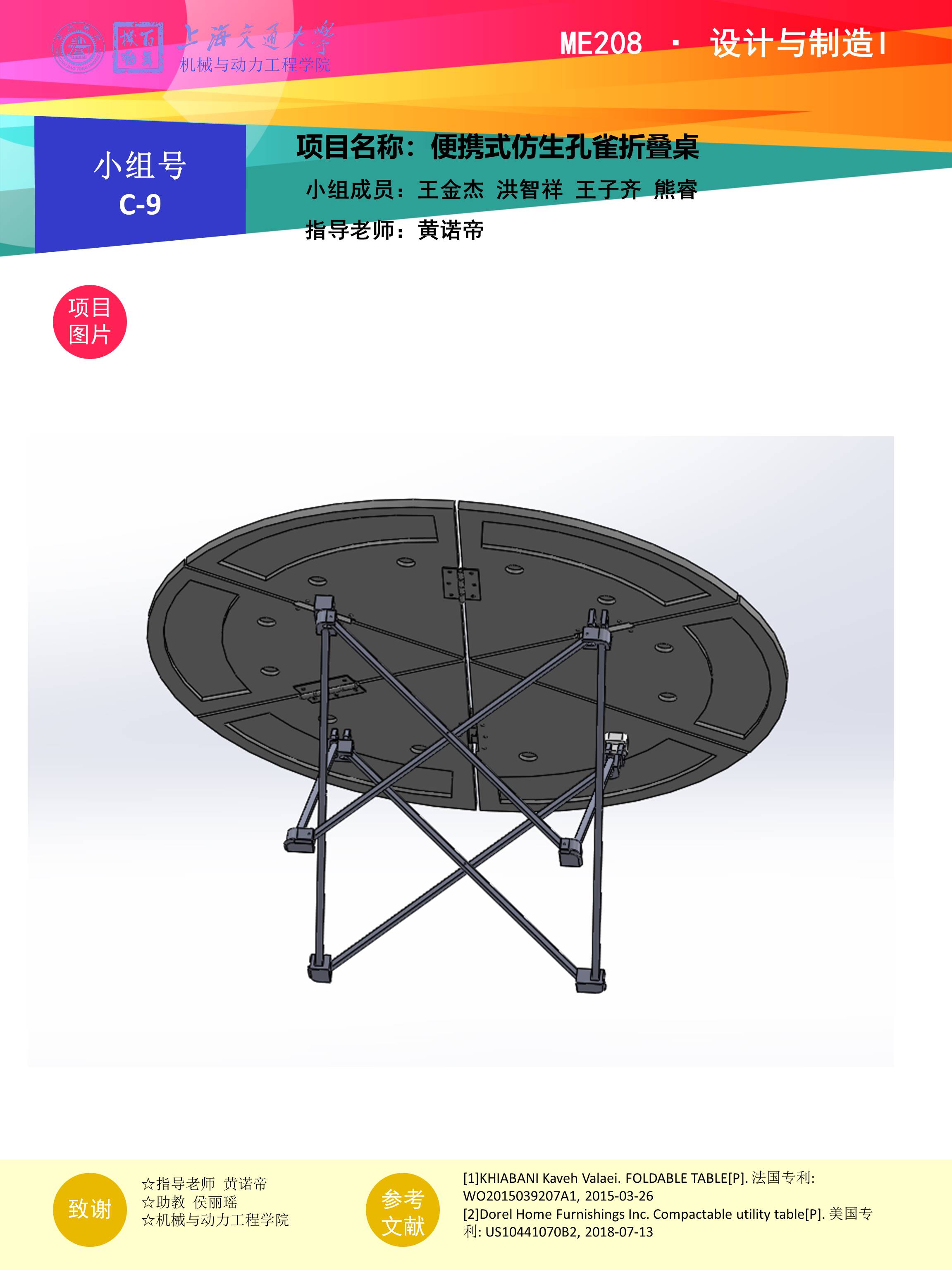 为实现桌面的折叠功能,将桌面分成六个板块,板块之间以合页交错连接。为实现便携目的,桌子底座亦同样采用折叠结构,利用桁架形式实现其功能。为使安装过程较为便利,桌面部分与底座之间利用磁吸相连。基本功能均已实现。将目前市面上没有的圆形、高折叠率折叠桌变为现实,将其理论知识变为现实经验。机械结构较为简单,但可实现桌子的基本功能,同时拥有较大程度的折叠功能。为方便安装,设计了磁吸装配方式,项目可塑性高。