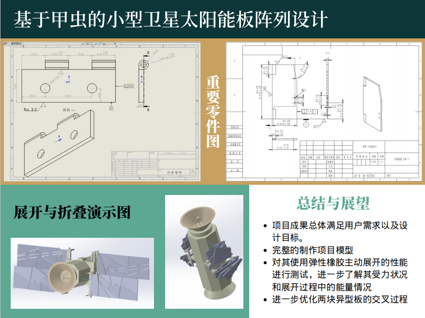 随着科技水平的发展,人们对于宇宙的探索日趋深入,小型卫星作为探索宇宙空间的重要工具被广泛使用。我们注意到,能源问题一直是卫星制造过程中的重点,为了保持长时间的续航,卫星会搭载太阳能板以提供动力,而太阳能板的结构设计中涉及如何使折叠体积小、展开过程稳定、展开后面积大等问题。本作品聚焦于改良小型卫星太阳能板的结构,通过仿生Rove Beetles的翼翅结构设计太阳能板折纸结构,利用合页与高应变弹性材料组合连接各块太阳能板,提高封装率,实现紧凑折叠与大面积展开。