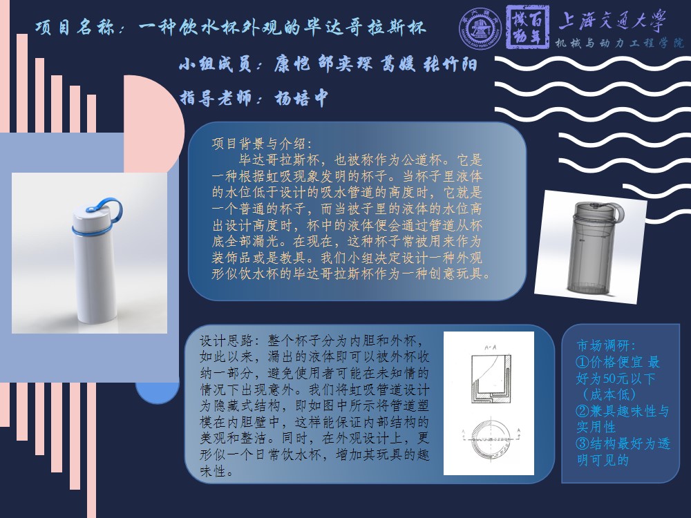 我们小组根据市场调查结果以及设计制造中可能会出现的问题进行项目开展。我们设计出了外杯与内胆结合的形式,内胆主要实现毕达哥拉斯杯的主要功能,而外杯主要作为盛放漏出液体的容器,从而使产品兼具创意趣味性和实用性。同时,我们将虹吸管设计在内胆壁上,使得产品外观简洁且结构巧妙。本产品计划采用ABS塑料和304不锈钢作为主要材料,成本较为低廉,最终价格大致控制在50元左右。综上,本项目最终项目成果满足项目设计主要目标。