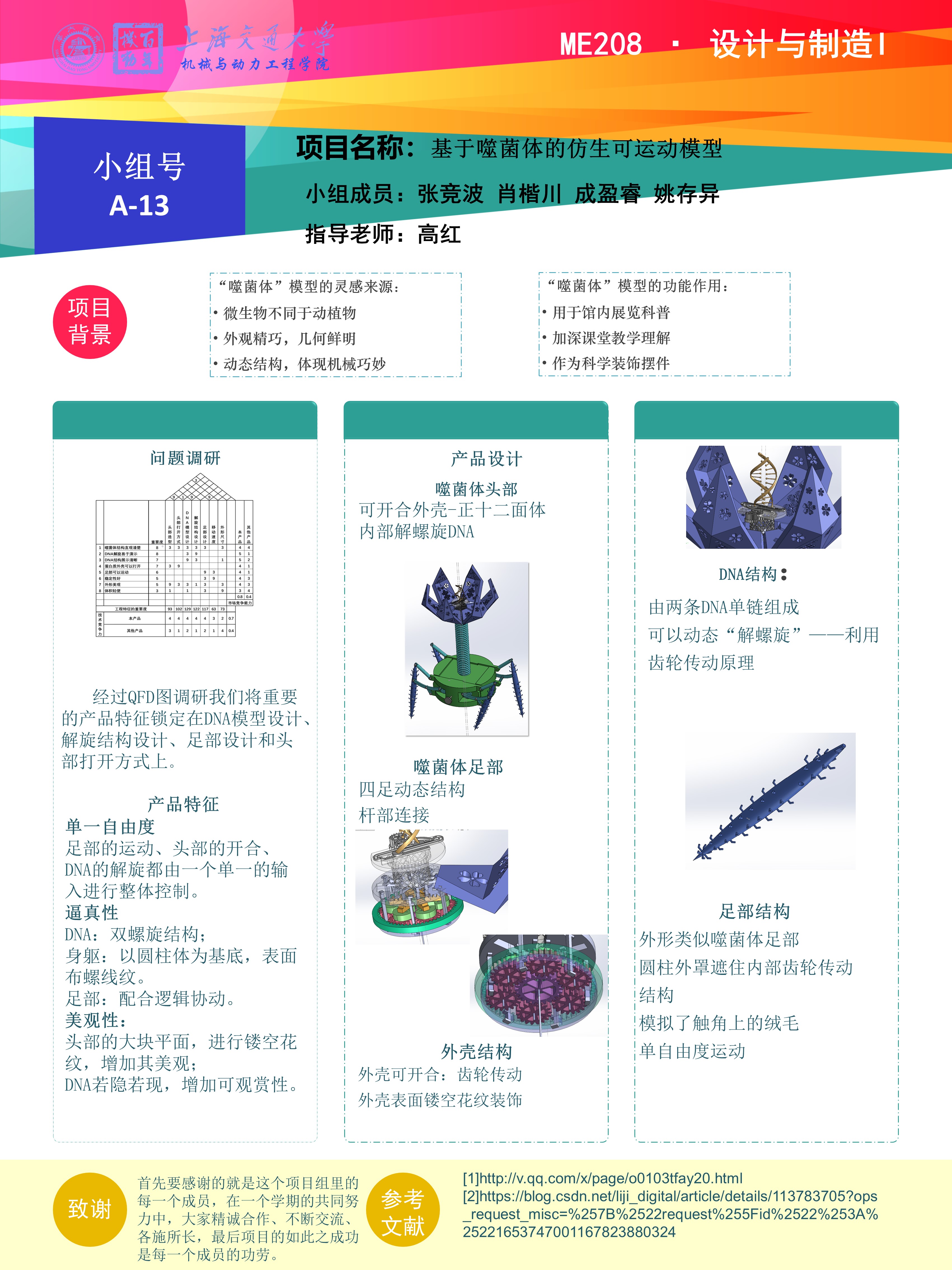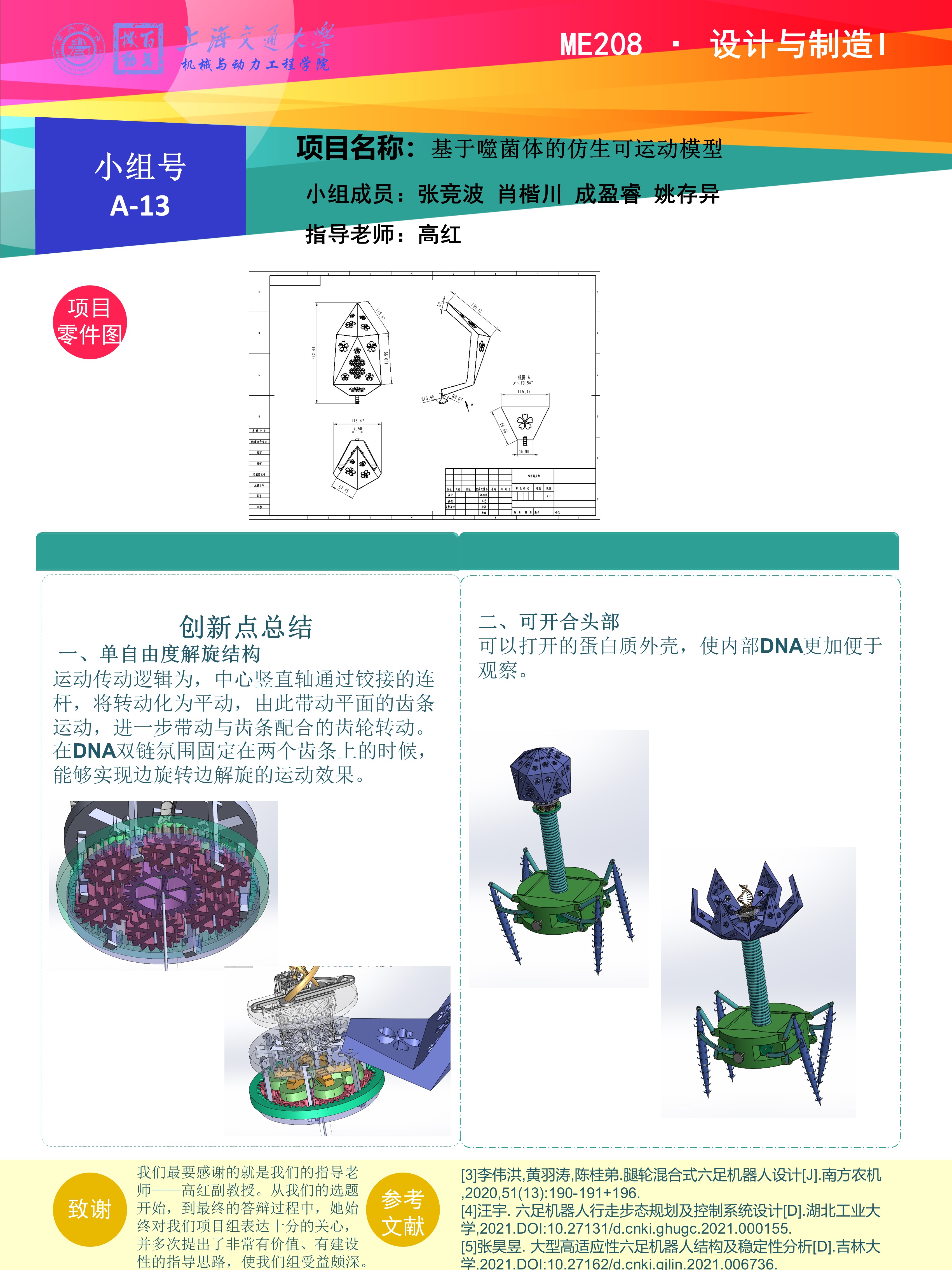为了能够对学校的教授和学习工作起到一定帮助,亦可作为值得收藏的装饰性仿生工艺品,我们的项目通过三维设计软件Solidworks,基于噬菌体病毒,设计出其仿生三维模型,并通过连杆、齿轮等传动方式,使其具备移动和动态展现其生理活动的功能,并生成现实可行的用于3D打印或机械加工的相关零件文件以及其完整的三维装配文件,以达到可行、逼真、美观的要求。重要的产品特征为DNA模型、解旋结构、足部和头部打开方式。