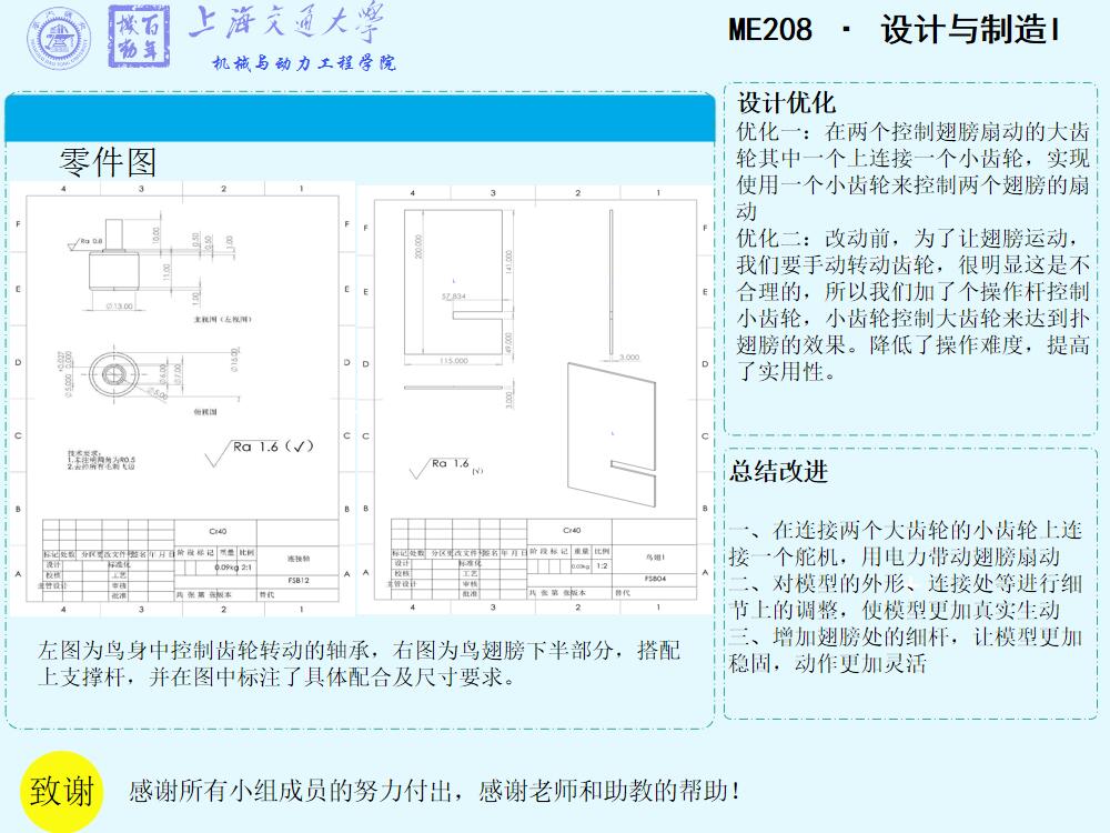 我组项目是一个啄木鸟的仿生模型,该模型以观赏性为主,还具有一点娱乐性和趣味性。模型特性是灵活、真实、美观,规格在500×500×200左右。在模型外形上,我们在大体上仿照了啄木鸟,舍弃了一些细节。在功能仿生上,我们实现了啄木鸟翅膀的扇动。关于使用到的设计与制造相关技术,模型翅膀采用了曲柄连杆结构,通过大小齿轮带动翅膀的扇动;模型头部和身体分离,留给关键结构更多空间,提高了制造时的容错性。