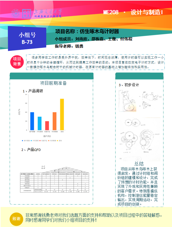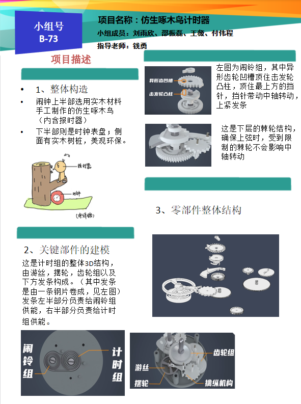 很多同学在工作时易受外界干扰,效率低下,时间观念淡薄,为了帮助人们实现烹饪,锻炼,工作学习的定时提醒,使用计时器可以实现工作一小时休息十分钟的合理循环,从而达到提高工作效率的目的。本组意在改变电子计时方式,设计一款模仿啄木鸟敲击树干的机械计时器,在原有计时器的基础上增加趣味性和实用性。
